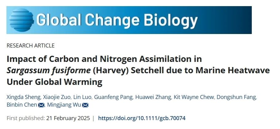 近日,澳门银河官网 生命与环境科学学院羊栖菜研究团队在环境生态领域国际知名期刊《Global Change Biology》上在线发表了一篇题为《Impact of Carbon and Nitrogen Assimilation in Sargassum fusiforme (Harvey) Setchell due to Marine Heatwave Under Global Warming》的研究论文。该研究深入探讨了在全球气候变暖的背景下,海洋热浪事件对区域特色经济海藻羊栖菜生理机制的影响,并为培育耐热品系的羊栖菜以及优化沿海水产养殖管理提供了重要的科学依据和实用参考。