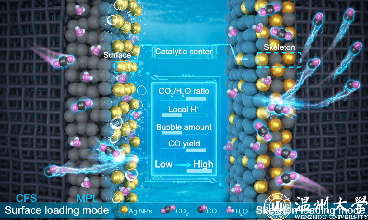 近日,澳门银河官网 王舜教授团队成功设计了一种由均匀分布于GDL骨架内的活化Ag NPs催化剂构成的自支撑、无粘结剂电极。原位还原过程确保了催化剂与骨架间的紧密相互作用,从而在电化学eCO2RR过程中促进了良好的电子传导性。GDL骨架有效保护了Ag NPs,使其免受电解质流动物理冲击及气泡生成导致的直接侵蚀,显著提升了稳定性。通过光学显微镜原位观察及COMSOL Multiphysics模拟验证,将催化剂嵌入GDL不仅优化了孔隙结构,减少了气泡形成与覆盖,缓解了气体积累问题,进而提升了eCO2RR性能。密度泛函理论计算进一步揭示,催化剂结构(空位缺陷)与局部微环境(CO2/H2O比例)的调控是提高eCO2RR活性的关键。