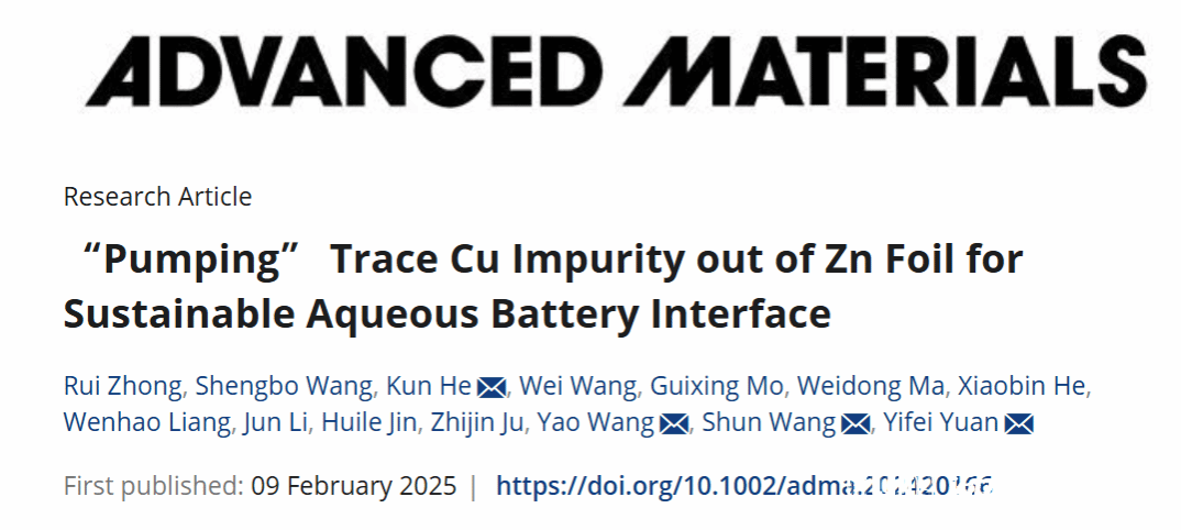 相关研究成果以“‘Pumping’ Trace Cu Impurity out of Zn Foil for Sustainable Aqueous Battery Interface”为题发表在国际顶级期刊《Advanced Materials》。澳门银河官网 为第一通讯单位,澳门银河官网 化材学院硕士研究生钟锐、浙江工业大学硕士研究生王盛博为共同第一作者,澳门银河官网 化材学院袁一斐、王舜、何坤教授,浙江工业大学王垚教授为共同通讯作者。