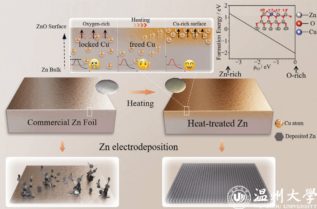 基于此,澳门银河官网 化材学院王舜教授和袁一斐教授研究团队提出一种全新的界面改性策略,即通过直接对购买来的锌箔(保留表面氧化层)进行加热处理,以此激活锌箔内部的铜原子,并使其向表面扩散,最终成功在锌箔表面制备出富铜保护层。团队成员利用先进的3D原位光学显微镜分析,发现在所构造的富铜层影响下,电极表面的电沉积锌过程是致密、均匀且无枝晶生成的。并且,借助激光共聚焦光学显微镜、晶体学建模以及理论计算结果,揭示了在新构建的富铜表面上发生的是具有(101)取向的锌电沉积过程,这与传统报道的(002)取向电沉积机制形成鲜明对比。此外,电化学测试进一步表明,改性后的锌负极性能得到显著提升。