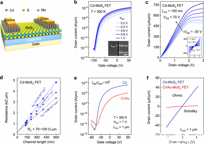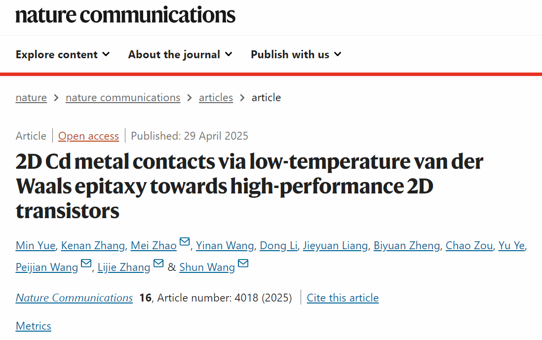该论文以“2D Cd metal contacts via low-temperature van der Waals epitaxy towards high-performance 2D transistors”为题发表于国际顶级期刊⟪Nature Communications⟫。澳门银河官网 为第一通讯单位,我院22级硕士生岳敏为第一作者。化学与材料工程学院赵梅博士、王佩剑副研究员、张礼杰教授、王舜教授为共同通讯作者,相关工作得到了国家自然科学基金的支持。