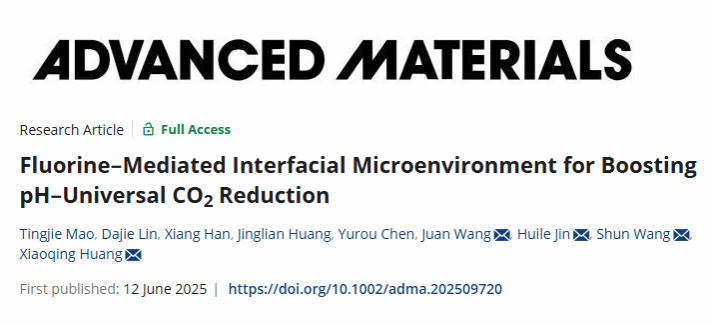 近日,澳门银河官网 化材学院校王舜/金辉乐/王娟团队以及厦门大学黄小青教授在国际顶级期刊《Advanced Materials》发表题为“Fluorine–Mediated Interfacial Microenvironment for Boosting pH–Universal CO2 Reduction.”的学术论文。在这项工作中,使用缺陷辅助策略成功的将镍物种(单原子和原子簇)锚定在氟碳基材(FC)上,通过构建单原子耦合原子团簇策略制备得到了高效稳定的CO2RR电催化剂,优化后的Ni/FC在酸性、中性和碱性电解质中表现出优异的FECO,分别为92.0%、99.1%和98.8%。相反,当F元素不存在时,HER过程占主导地位。更重要的是,Ni/FC可以在宽pH范围内保持优异的FECO。值得注意,在工业电流密度(200 mA cm-2)下能稳定运行3000小时,明显优于最近在不同电解质条件下报道的电催化剂。结合密度泛函理论(DFT)计算、原位红外光谱(ATR-FTIR)以及原位增强拉曼测试表征全面揭示了引入F后FECO增强和FEH2抑制的内在原因:F的高电负性将导致正Cδ+中心的形成,这会抑制氢的吸附,提高界面水的离解能垒,从而抑制竞争性HER过程(即正电碳Cδ+中心能够 “隔离”质子,抑制HER)。同时,气-固-液界面处产生的局部微环境有利于降低速率决定步骤(RDS)的能量势垒,从而促进CO2转化为CO。