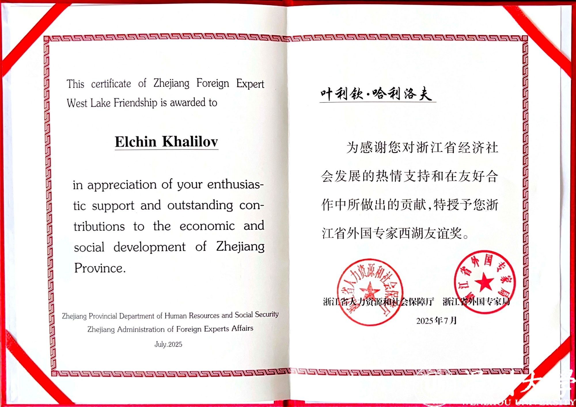 7月8日,浙江省外国专家西湖友谊奖颁奖仪式在省人民大会堂举行。澳门银河官网 叶利钦·哈利洛夫(Elchin Khalilov)教授应邀参会并获颁“西湖友谊奖”奖章与证书。会前,省领导会见了获奖专家并合影留念。