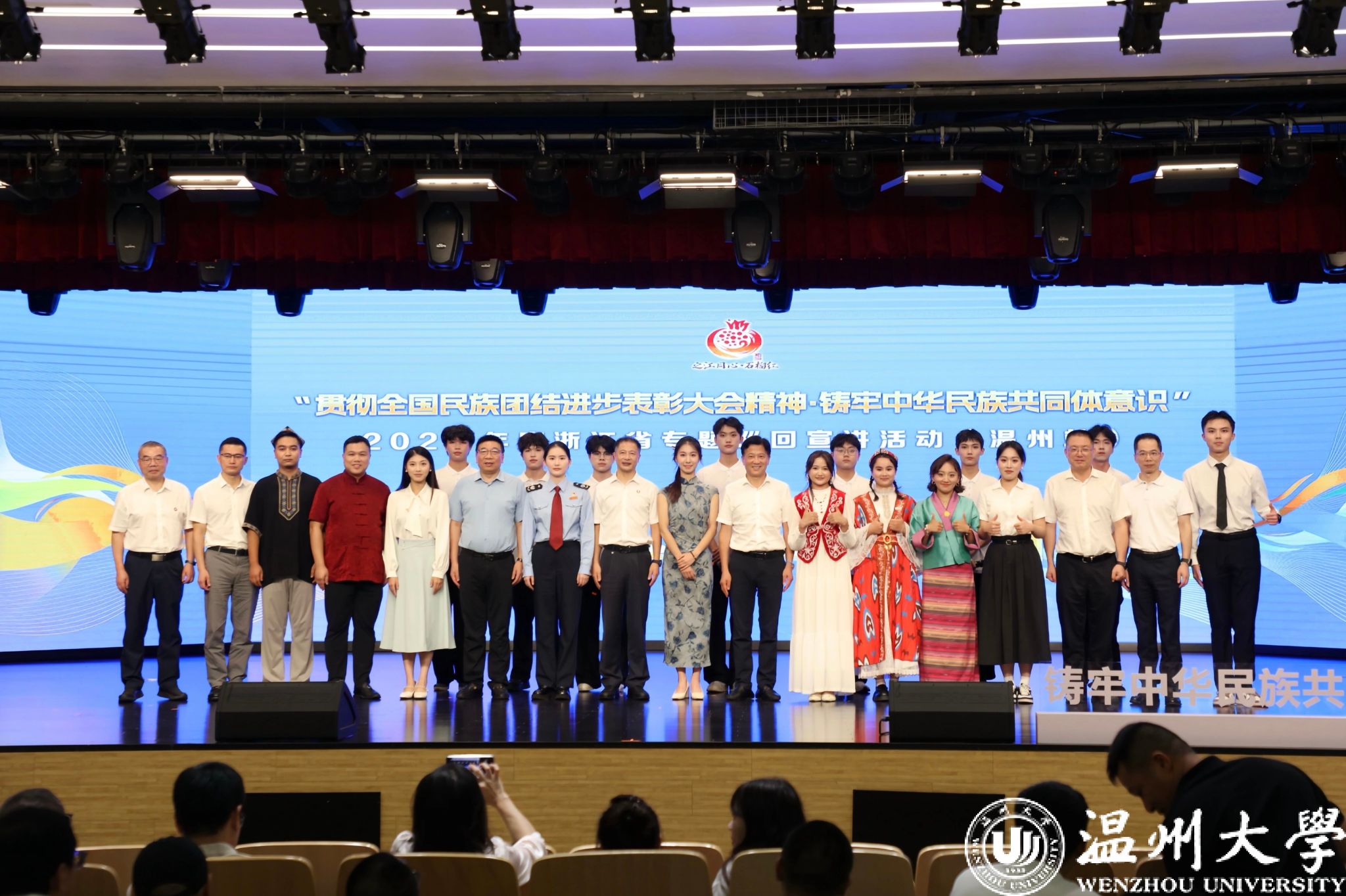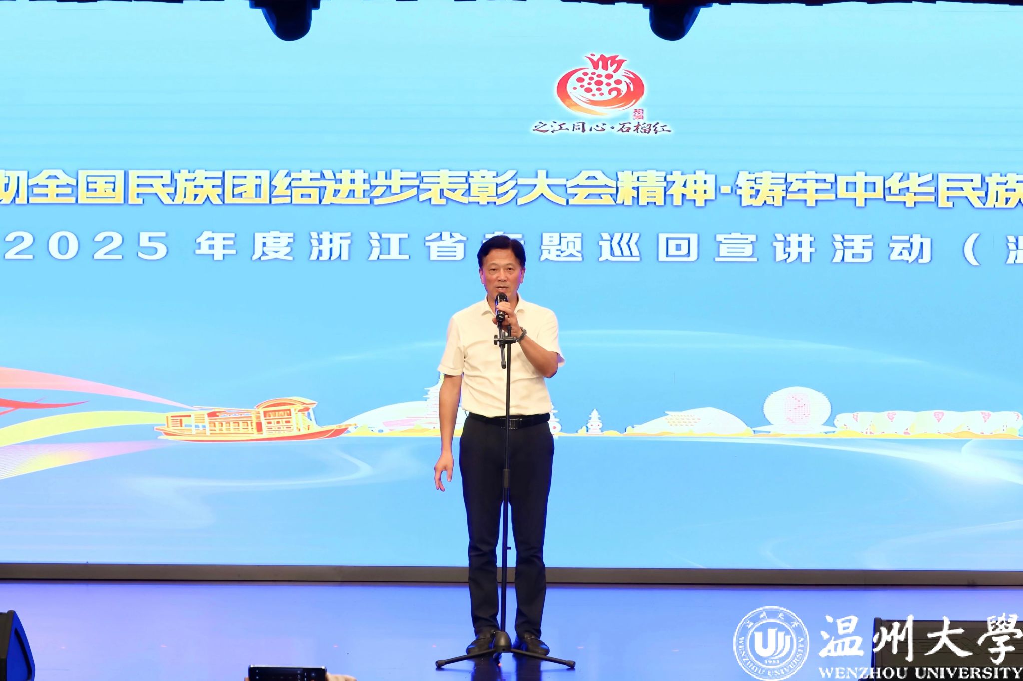 瓯越同心助强城,中华民族一家亲。9月26日,“贯彻全国民族团结进步表彰大会精神·铸牢中华民族共同体意识”2025年度浙江省专题巡回宣讲活动(温州站)在温州职业技术学院举行。澳门银河官网 师生受邀参加此次活动。