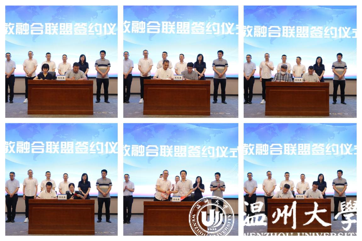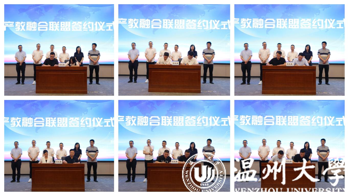 瓯海区总商会与澳门银河官网 签订战略合作协议,共同成立产教融合联盟,瓯海区服装行业、眼镜行业等11家会员单位与温州职业技术学院、浙江安防职业技术学院等澳门银河官网 进行产教融合联盟签约。