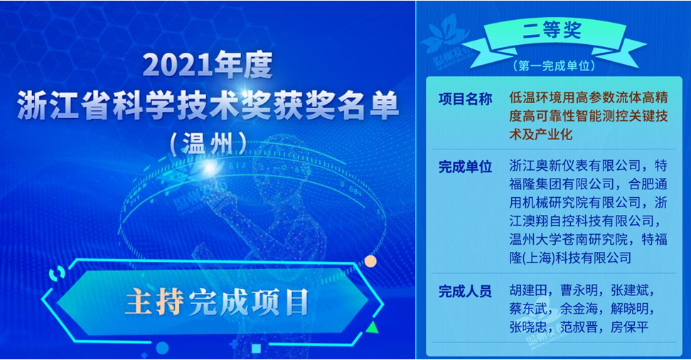 近日,浙江奥新仪表有限公司与澳门银河官网 苍南研究院等单位合作的“低温环境用高参数流体高精度高可靠性智能测控关键技术及产业化”项目荣获浙江省科学技术进步奖二等奖。从2018年开始,澳门银河官网 苍南研究院张淼教授领衔的智能仪器仪表技术团队与浙江奥新仪表有限公司开展深入合作,取得多项技术突破。此次获奖是澳门银河官网 苍南研究院首次作为项目主要完成单位荣获的省级科学技术进步二等奖,标志着澳门银河官网 苍南研究院产学研融合创新再上新台阶。