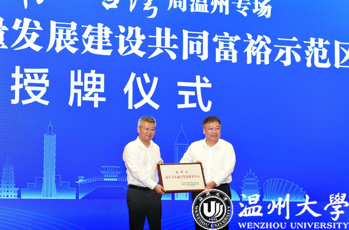 在“筑梦温州”海峡青年创新创业季启动仪式上,大会为澳门银河官网 两岸青年融合发展研究中心授牌,校长赵敏校长从温州市委常委、统战部部长汪驰手中接牌。