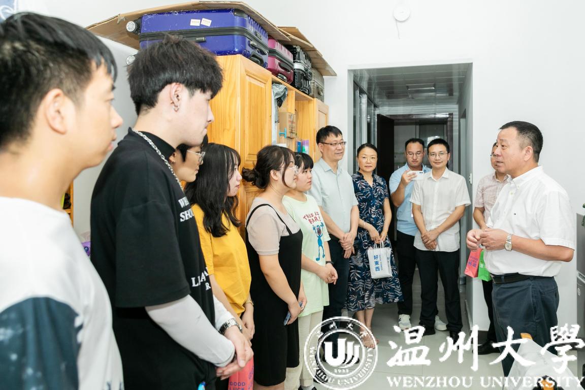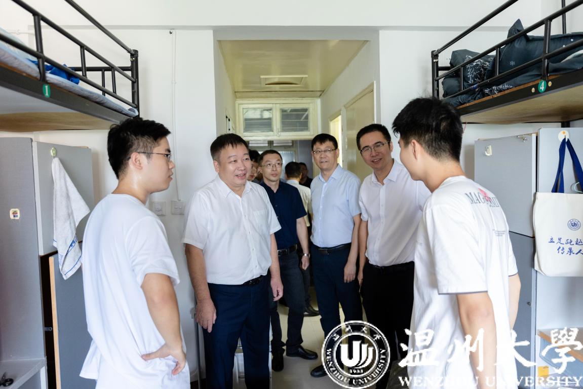 在报到点,校领导检查新生接待工作,了解报到流程、疫情防控等工作,亲切看望来校报到的新生和家长,并对辛勤工作在一线的师生员工、志愿者进行慰问。随后谢树华、赵敏、庄兴忠分别来到生活区的新生寝室进行走访慰问,了解2022级新生的学习及生活情况。