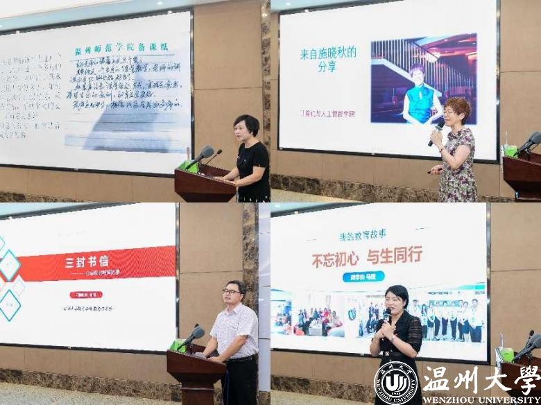 四位优秀教师代表分享“我的教育故事”,带领我们悉心体悟感人的教育事迹。温州市师德楷模获得者、生环学院的应雪萍老师以“春风化雨铸师魂 润物无声育桃李”为主题,分享了她三十年从教经历中的典型案例和深刻感悟,并表示教育之路唯有爱和榜样,有温度的教育才能产生巨大的力量。浙江省“万人计划”教学名师、温州市师德楷模获得者、计算机学院的施晓秋老师讲述了教师生涯的感悟,她认为责任决定实干担当、匠心决定品质创新、敬畏决定敬业无悔,培养学生应勇于创新、脚踏实地、发扬传承、胸怀全局,真正做到“只问初心、无问西东,只问是非,不计利害”。第十届华峰品德奖、校优秀教师、优秀班主任获得者,教育学院的杨刚老师从“三封书信”开启他的教育故事,介绍了“学风育人、生活育人、思政育人、科研育人、情感育人、团队育人”六大育人理念,从文化育人、科研育人、师范育人视角对澳门银河官网 的文化建设、学科发展、服务地方等方面进行了深入思考,展现了其“为党育人、为国育才”的初心使命。温州市优秀教师获得者、校教学名师、商学院的马媛老师以“坚守初心,与生同行”为主题,分享其辅导学生竞赛、自身参与教学技能比赛的精彩故事,创新“以赛育人”新模式。