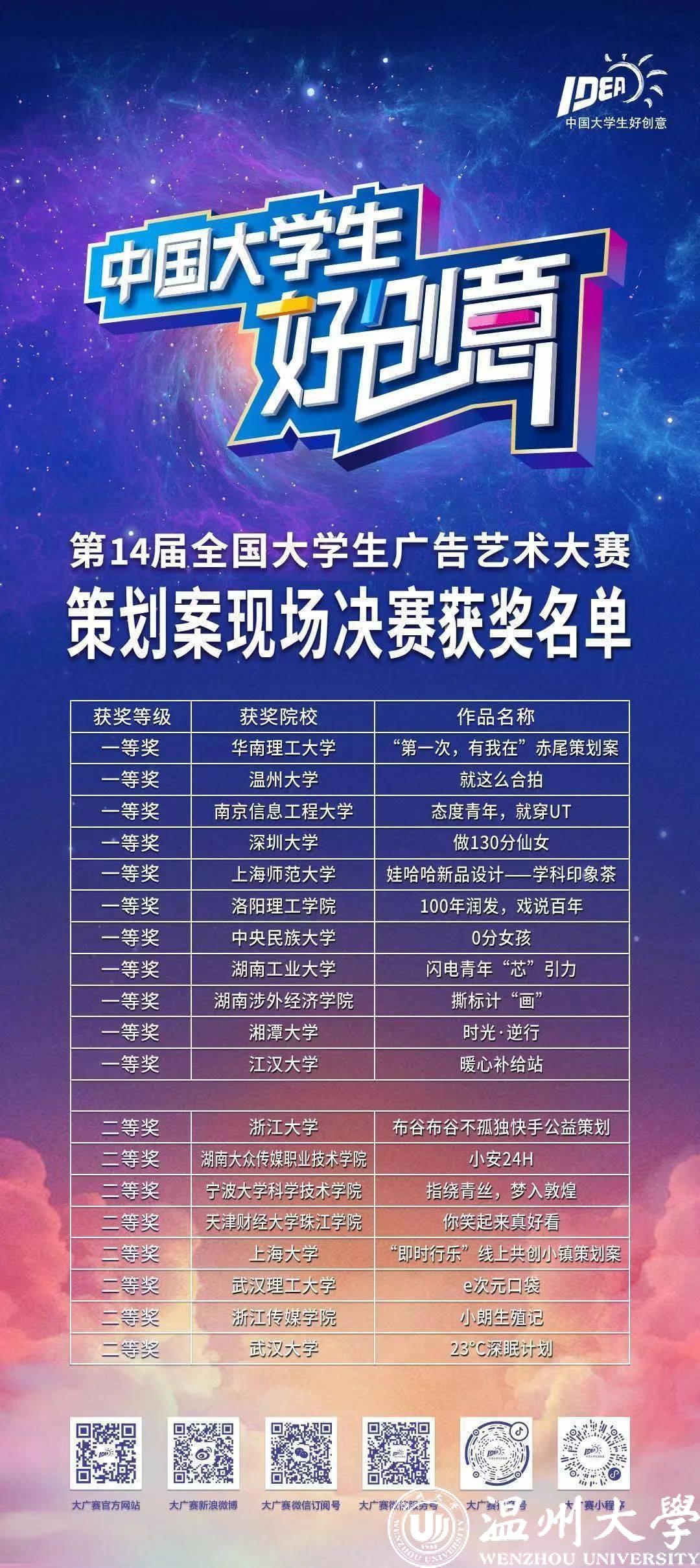 据悉,大广赛策划案类别比赛是全国大广赛中门类最复杂、要求最高的比赛类型,澳门银河官网 在该类型赛事上一向表现卓越,每一年都有策划案类别的全国等级奖项,今年除了决赛而出的《就这么合拍》一等奖,还有《中国可乐有“股气”》《现充青年》两项二等奖和《“银发冲浪”计划》等五项全国优秀奖。银河 广告专业是澳门银河官网 省特色专业,以培养高素质应用型广告与文化创意人才为根本诉求,强化多元化学科竞赛,在学科竞赛上成果丰硕。近年来,广告学专业学生参加国家级、省部级以及行业协会等各类赛事获奖达100多项,在全国大学生广告艺术大赛中,获得了全国一等奖4项、二等奖7项、三等奖11项、优秀奖13项;“互联网+”大赛国家级银奖;在最近三届上海国际广告节新锐挑战营中,获得冠军一项,亚军两项,季军一项。
