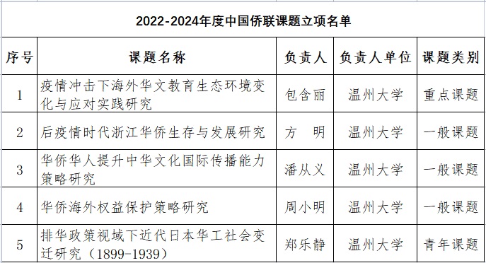 近日,中华全国归国华侨联合会发布《2022-2024年度中国侨联课题立项结果公告》。澳门银河官网 喜获5项中国侨联项目,其中重点项目1项,一般项目3项,青年项目1项。中国侨联项目立项数在全国排名第四位,浙江排名第一位。