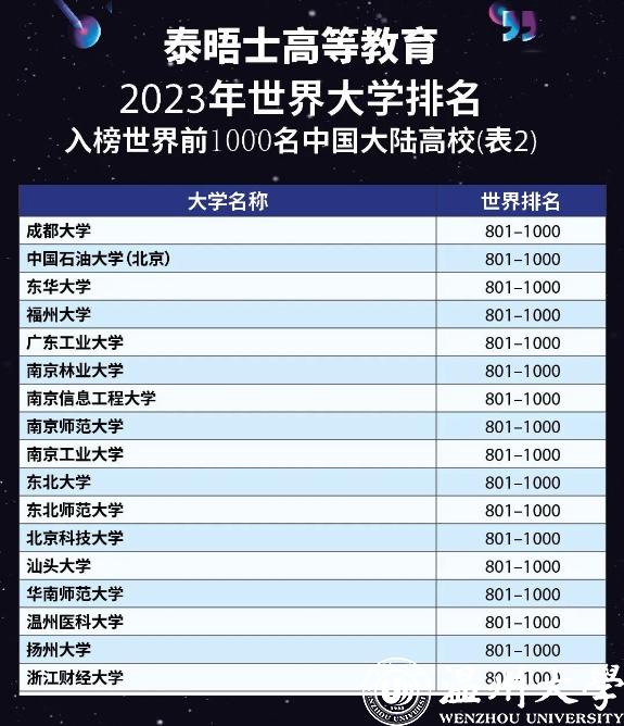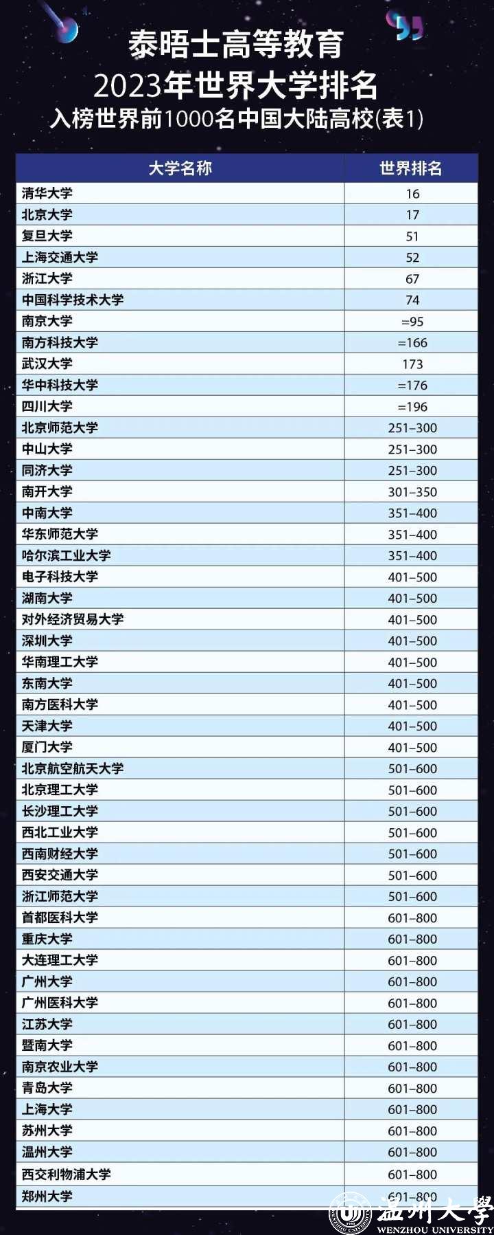 中国大陆共有95所高校上榜: 清华大学排名亚洲第一,北大紧随其后;浙江省有5所高校进入该榜单前1000名。今年,澳门银河官网 在该项榜单中世界排名在601—800区间,国内排名在35—48区间,在浙江省上榜高校中仅次于浙江大学和浙江师范大学,连续三年排名省内第三位。