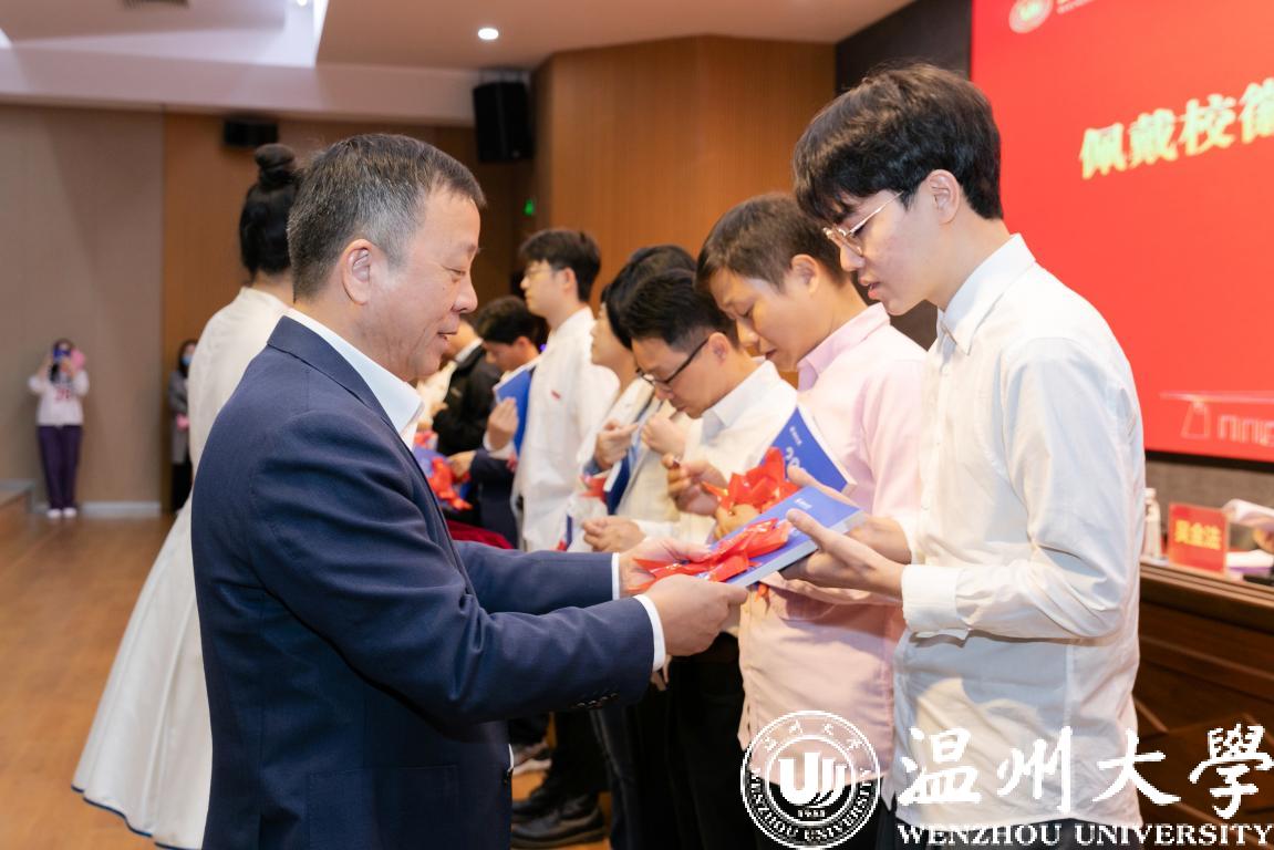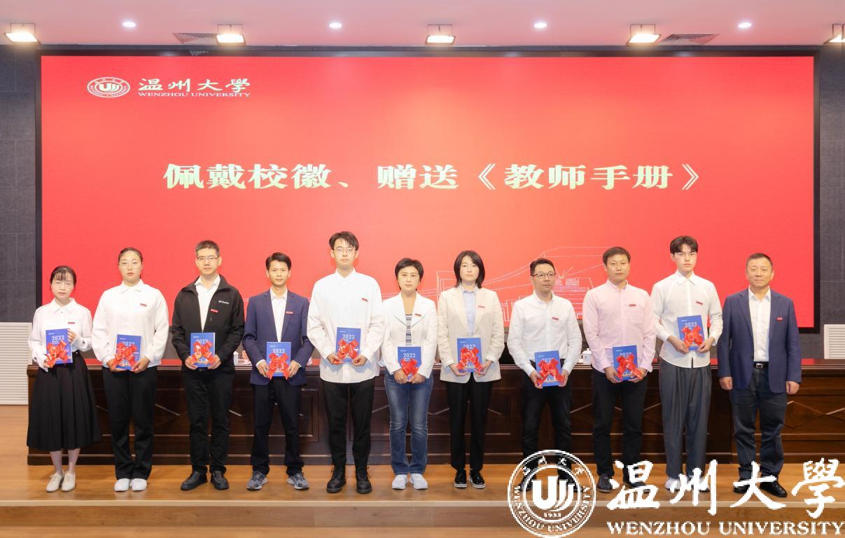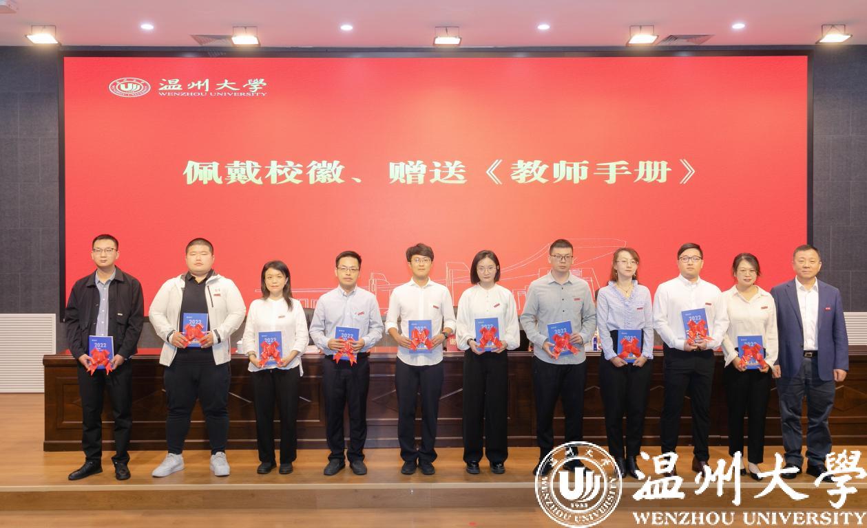 谢树华为新教师代表佩戴校徽,并赠送2022版《澳门银河官网 教师手册》,表达澳门银河官网 对新入职教师的热烈欢迎和殷切期望,希望新教师提升“银河 人”的归属感和责任感,勉励每一位新入职教师开拓进取、奋勇向前。