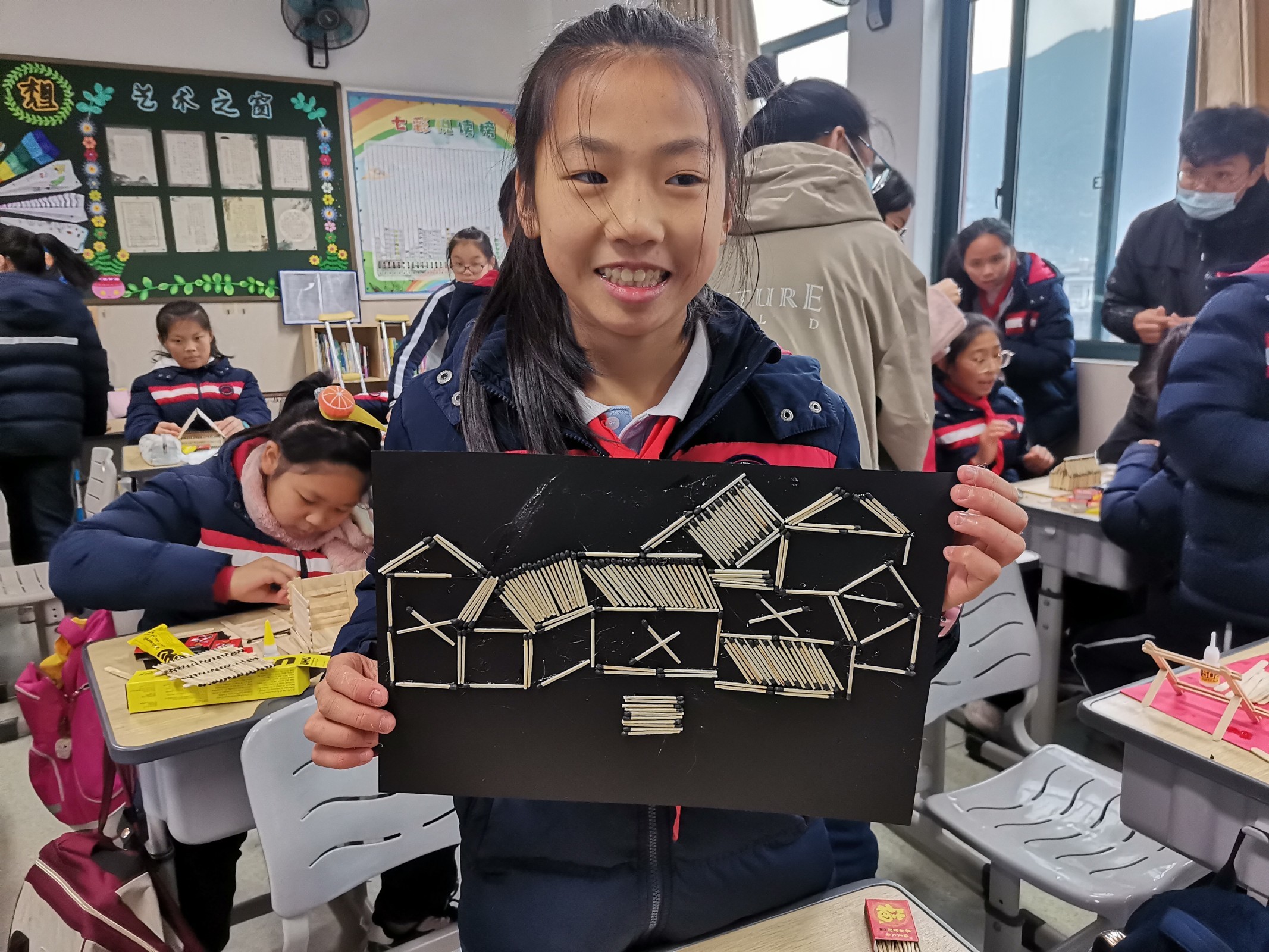 小学生火柴艺术作品合影