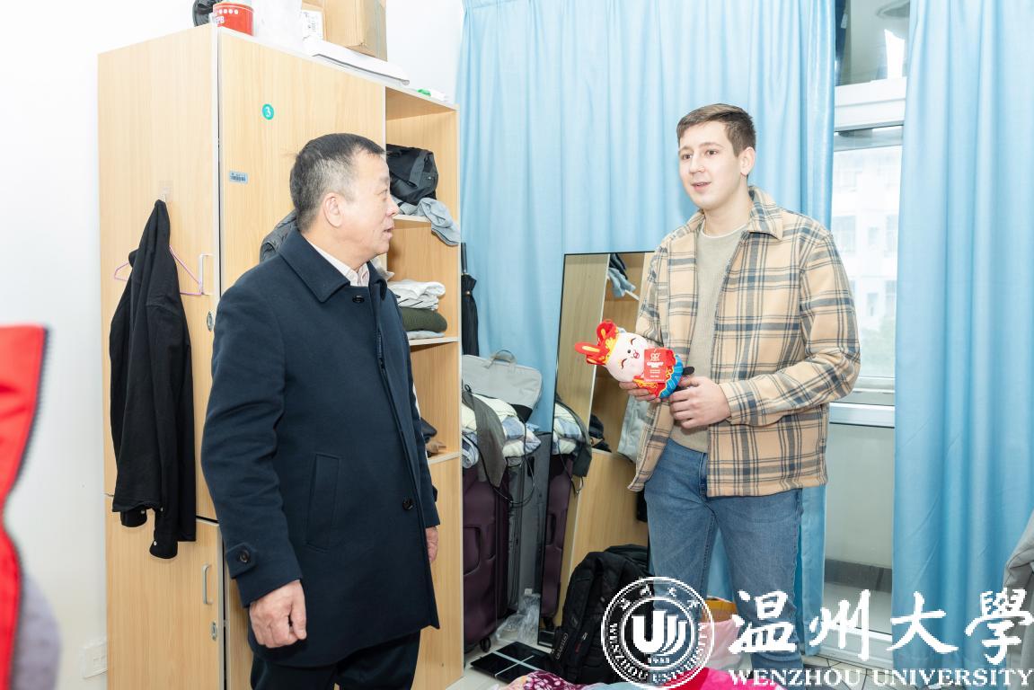 谢树华来公寓看望留学生,向留学生表达了新春问候,与留学生亲切交流互动,勉励留学生学好中文,更好更快融入澳门银河官网 大家庭,成为中外文化交流桥梁和使者。