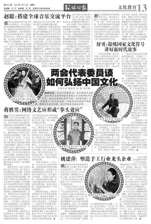 作为第十四届全国政协委员,蒋胜男提出了很多引发社会高度关注的提案,比如《关于网络文艺突破“九龙治水”,形成“拳头效应”,为推进中国式现代化提供强大精神力量的提案》。她告诉《环球时报》记者,新时代10年,网络文艺蓬勃发展结出的累累精神硕果,为文化自信自强作出了生动注解。但若想充分推动网络文艺成为中国式现代化的强大精神力量,还须从根本上解决发展中存在的一些问题和制约因素。