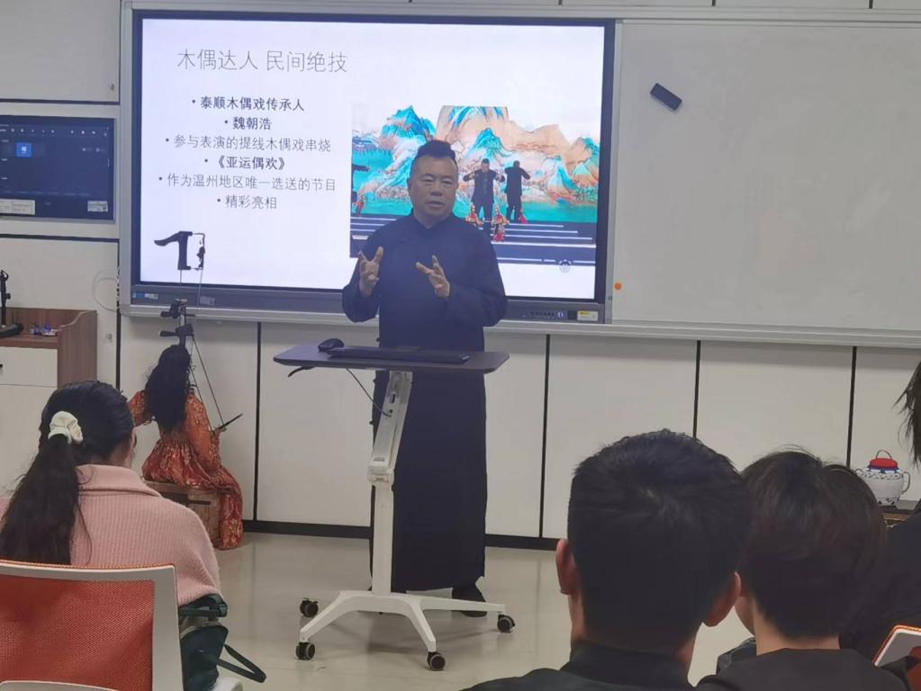 “非遗文化与劳动教育的融合不仅培养了学生的劳动观念和技能,还培养了传承中华优秀传统文化的兴趣”。近日, 国家级非遗项目传承人魏朝浩老师在澳门银河官网 为学生开展实践教学并表演提线木偶戏时如是说。魏朝浩是泰顺县政协委员,也是提线木偶戏代表人物之一。活动现场,魏朝浩老师向同学们讲解了提线木偶戏的历史,现场表演了《赛马》和《钟馗醉酒》两出经典剧目片段,赢得了同学们的阵阵掌声。之后,魏朝浩老师手把手教授了木偶人的操作技法。