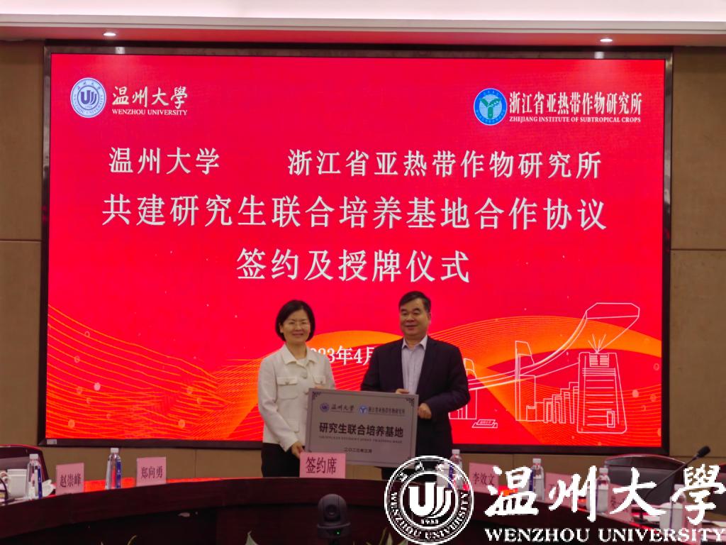 4月3日下午,澳门银河官网 与浙江省亚热带作物研究所就共建“澳门银河官网 —浙江省亚热带作物研究所研究生联合培养基地”正式签约并举行授牌仪式。副校长徐和昆,浙江省农业科学院党委委员、纪委书记张文出席签约仪式并致辞。浙江省亚热带作物研究所、澳门银河官网 研究生院、科技处、生命与环境科学学院及有关部门负责人及师生代表参加活动。