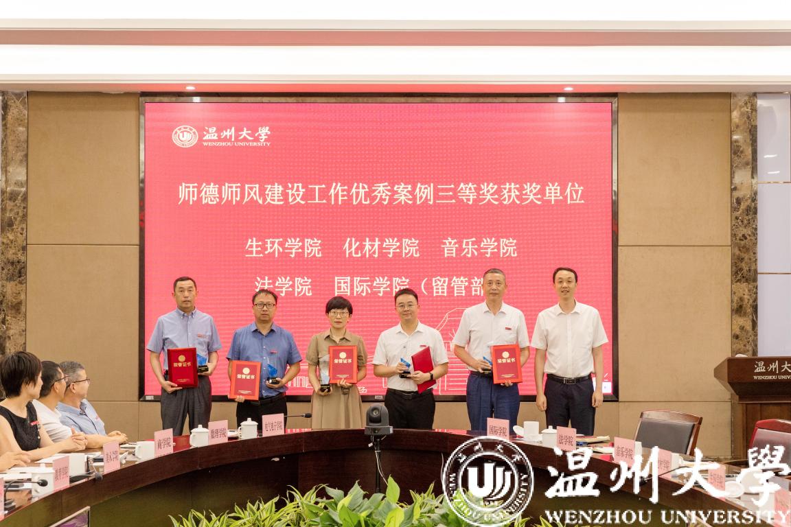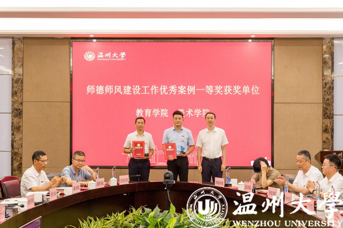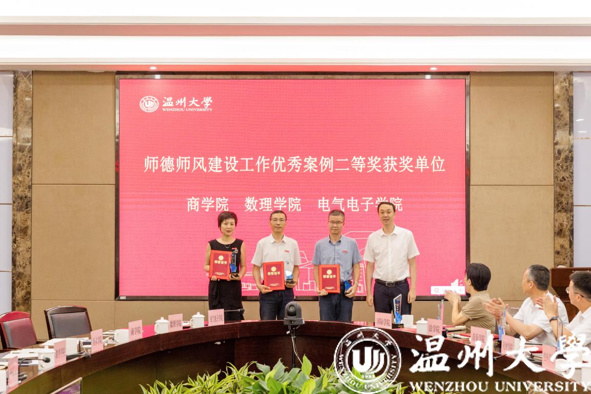 蔡曙光宣读师德师风建设工作优秀案例获奖学院名单,校党委书记张健为获奖学院颁发证书。