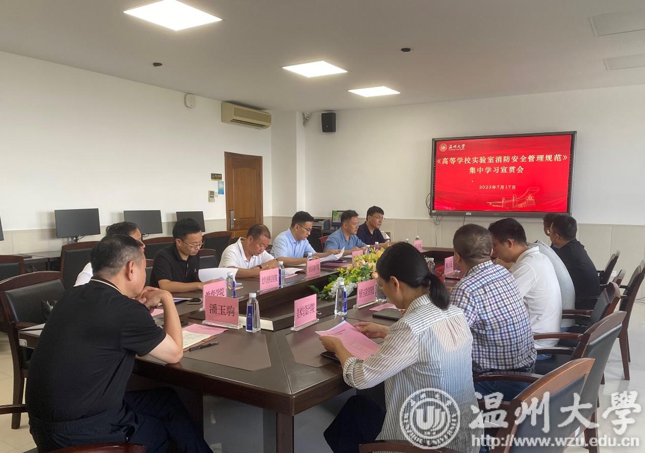 为加强澳门银河官网 实验实训室安全管理,提高实验实训室消防安全管理水平,7月17日下午,澳门银河官网 召开《高等澳门银河官网 实验室消防安全管理规范》专题学习会。潘玉驹副校长、温州市消防支队副大队长郑国前等出席会议。