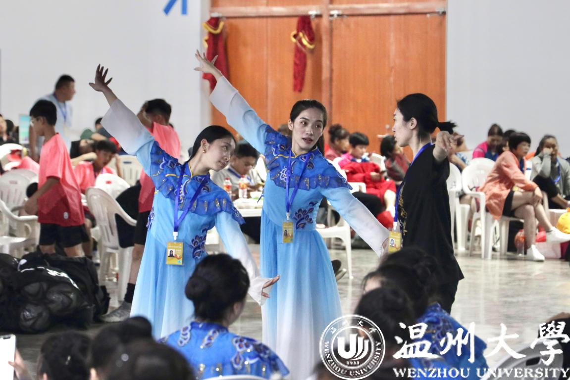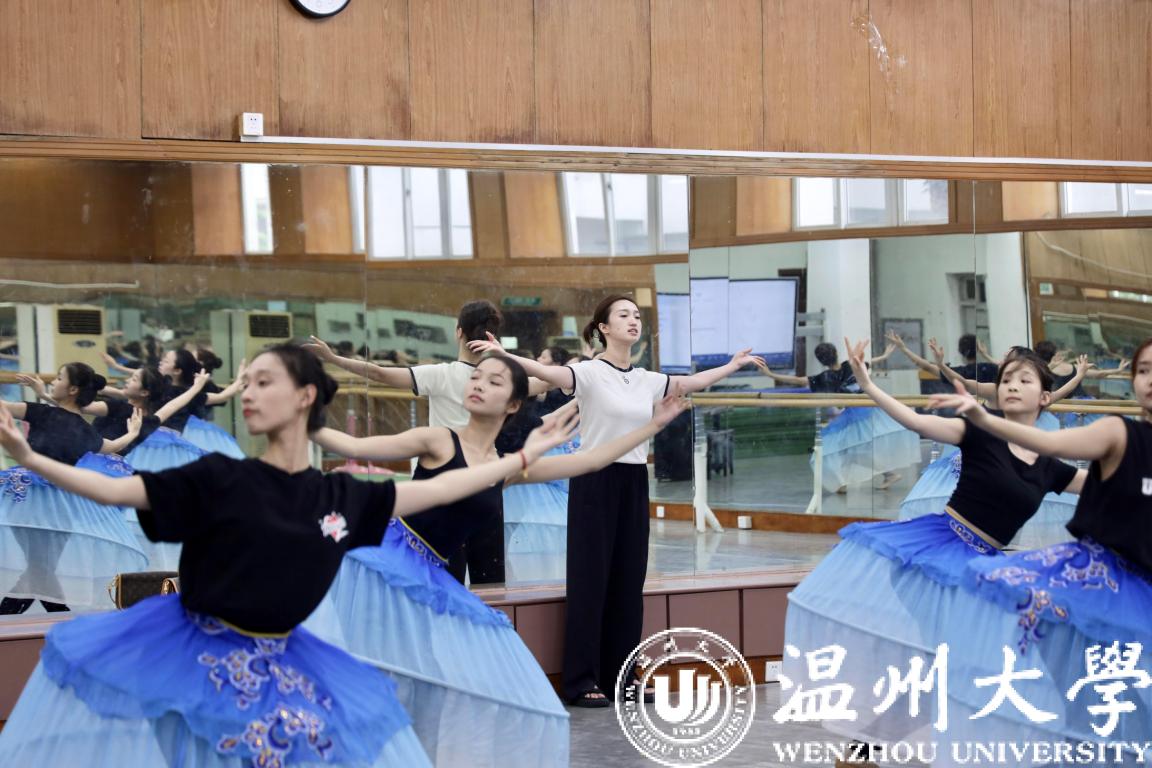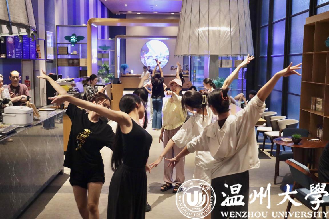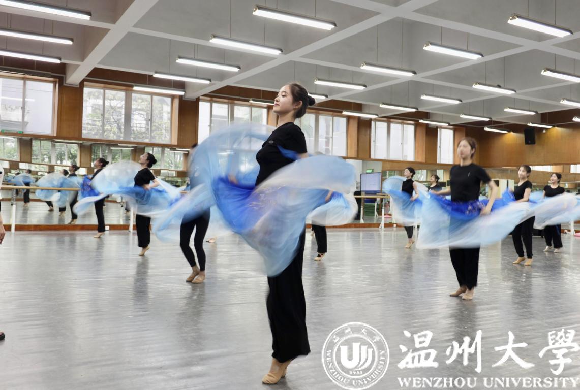 “我们表演的是龙舟乘风破浪时浪花奔涌的场面,通过温州传统舞蹈‘浮缸’展现瓯江潮水的意象。”澳门银河官网 音乐学院老师於睿介绍,浮缸舞由瓯剧传统剧目的片段《浮缸》演变而来,讲述了英雄岳飞出生时,汤阴县突发大水,岳母怀抱幼子,坐于花缸,在洪水中飘浮并得救的故事。通过有规律的颠簸、摇荡表现人在水里的漂浮和人在风浪中搏斗的动态,是戏舞与民间舞融合的典型。