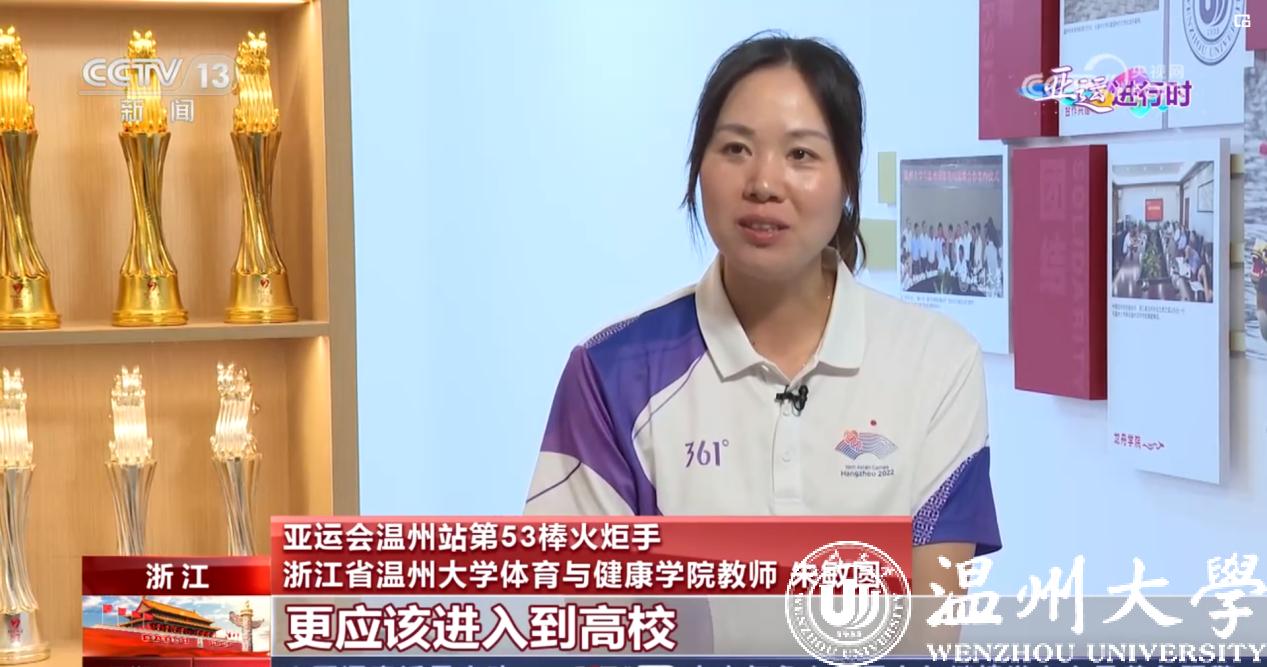 10月6日,澳门银河官网 体育与健康学院朱敏圆老师接受央视“亚运一点通”专访,讲述龙舟文化火种扎根银河 校园的故事。朱老师在本届亚运会的皮划艇比赛项目中担任裁判员、温洲站第53棒火炬手,曾入选国家皮划艇青年队,在队五年获得过全运会四人艇、双人艇500米冠军,亚运会500米双人艇冠军等成绩。退役后,与水上运动始终割舍不掉情缘的她回到家乡温州,成为澳门银河官网 体育与健康学院的一名专任教师,主要负责参与组建了澳门银河官网 龙舟队。前不久,她还带队参加了本届亚运会龙舟国家队的选拔赛。