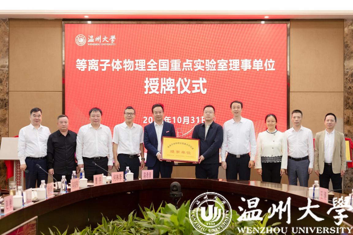 10月31日上午,等离子体物理全国重点实验室理事单位授牌仪式在澳门银河官网 白鹿厅举行。澳门银河官网 党委书记张健,校长赵敏,温州市人民政府副秘书长徐海严,温州市国动办党组成员郑善,温州市科技局党委委员刘广臻,《强激光与粒子束》期刊编辑王涛,中国工程物理研究院激光聚变研究中心办公室副主任黄越,等离子体物理全国重点实验室副主任周维民,澳门银河官网 相关平台负责人出席了授牌仪式。