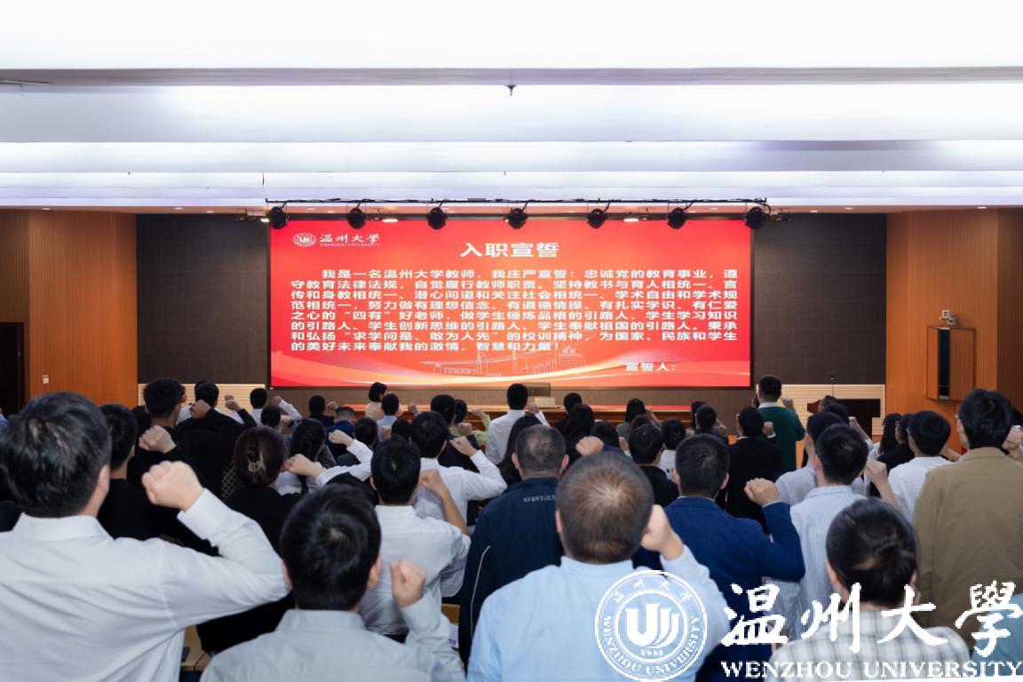 优秀教师代表发言。国家级青年人才、计算机学院陈慧灵,温州市优秀教师、商学院马媛,浙江省“高校辅导员年度人物”入围奖获得者、教育学院严晓秋等三位老师分别作为优秀教师代表分享他们的“教育故事”,讲述他们的为师、为学、为事、为人之道,情深意切、感人肺腑、令人启迪、深受教育。商学院马媛老师带领与会新教师进行了庄严的入职宣誓,用铿锵有力的誓言表达了教师们投身银河 教育事业的热情与忠诚。