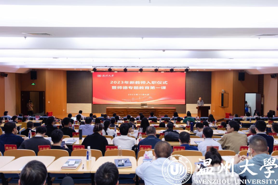 为深入开展学习贯彻习近平新时代中国特色社会主义思想主题教育、认真学习贯彻习近平总书记考察浙江重要讲话精神,11月8日下午,澳门银河官网 举行2023年新教师入职仪式暨师德专题教育第一课。校党委书记张健,副校长、党委委员潘玉驹出席会议。2022年10月份至今新入职的150多位教职工与校师德师风建设工作委员会委员参加会议。潘玉驹主持。