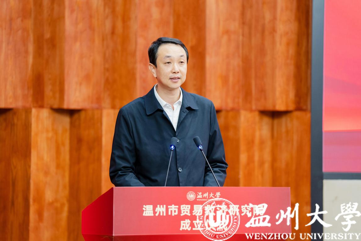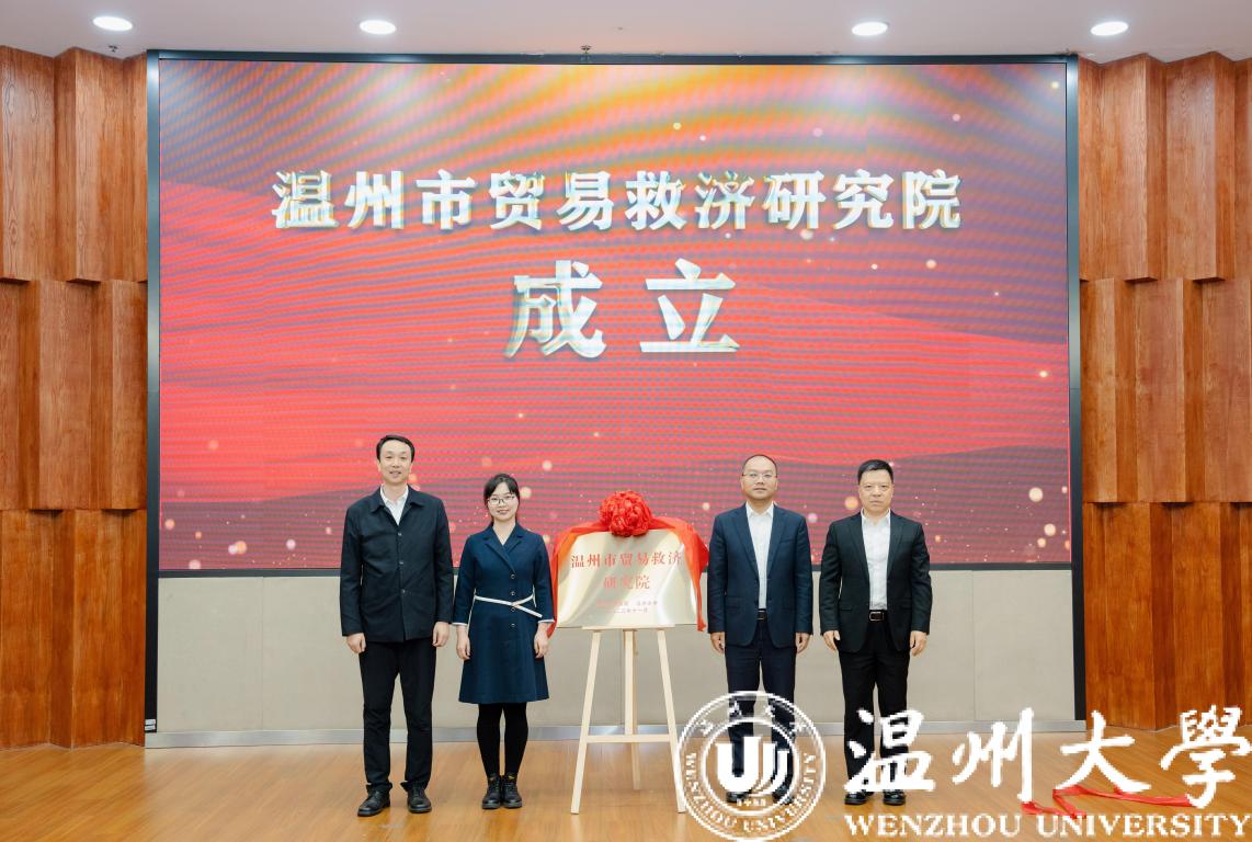 澳门银河官网 党委书记张健、温州市人民政府副市长陈宽、浙江省商务厅贸易救济调查局副局长张江婕、温州市商务局局长虞立清共同为“温州市贸易救济研究院”揭牌。