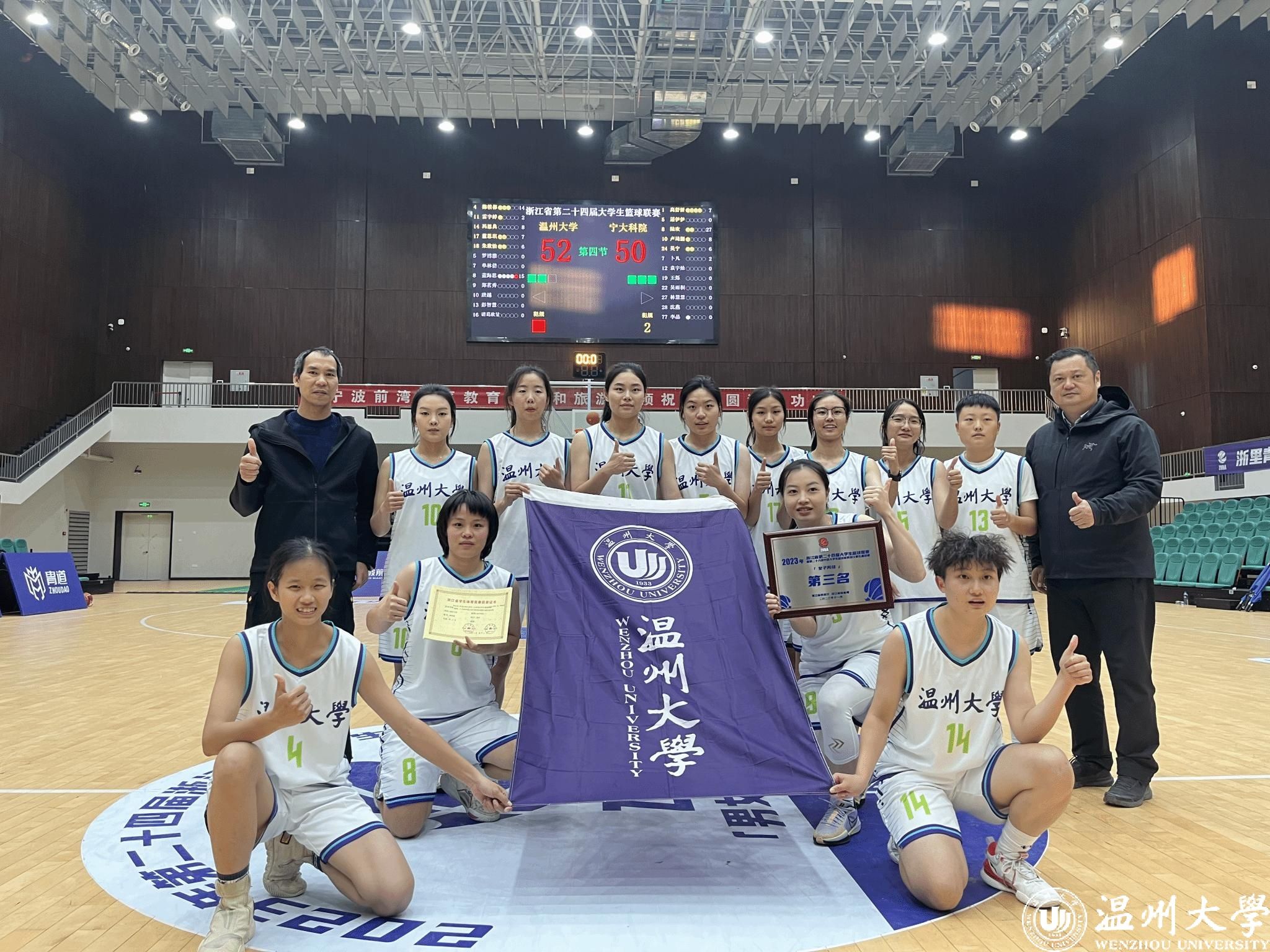 12月8日,浙江省第二十四届大学生篮球联赛(女子丙组)比赛在宁波市落下帷幕。在激烈的角逐中,澳门银河官网 女子球队在奋力拼搏,最终取得本届赛事季军。澳门银河官网 体育与健康学院队员朱欣怡、董海思荣获“优秀运动员”荣誉称号。