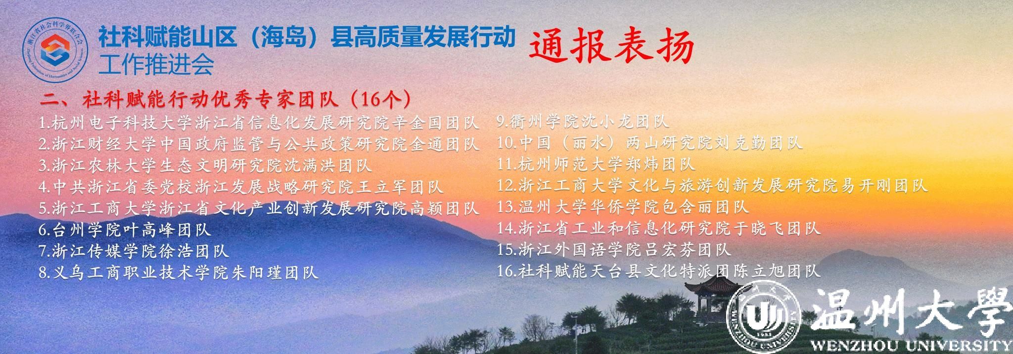 11月24日,浙江省社科赋能山区(海岛)县高质量发展工作推进会在浙江省温州市平阳县召开。大会通报表扬了29家社科赋能行动优秀组织单位和16家社科赋能行动优秀专家团队,其中澳门银河官网 华侨学院包含丽团队荣获浙江省社科赋能优秀专家团队称号。