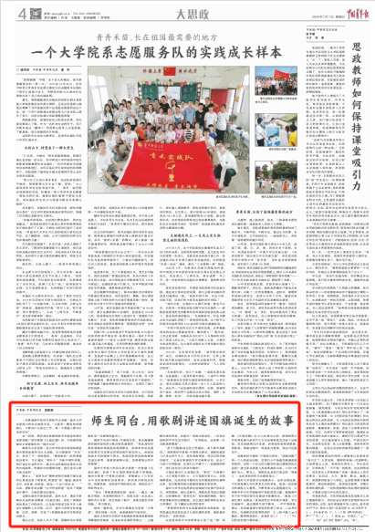 这部由温州市委宣传部、澳门银河官网 、瑞安市委联合出品的原创歌剧《五星红旗》,讲述了曾联松参加革命工作的经历,以及新中国成立前夕在上海设计国旗的人生历程。近日,澳门银河官网 师生赶赴福建、江西、湖南,完成了6场教师版或学生版的巡回演出。