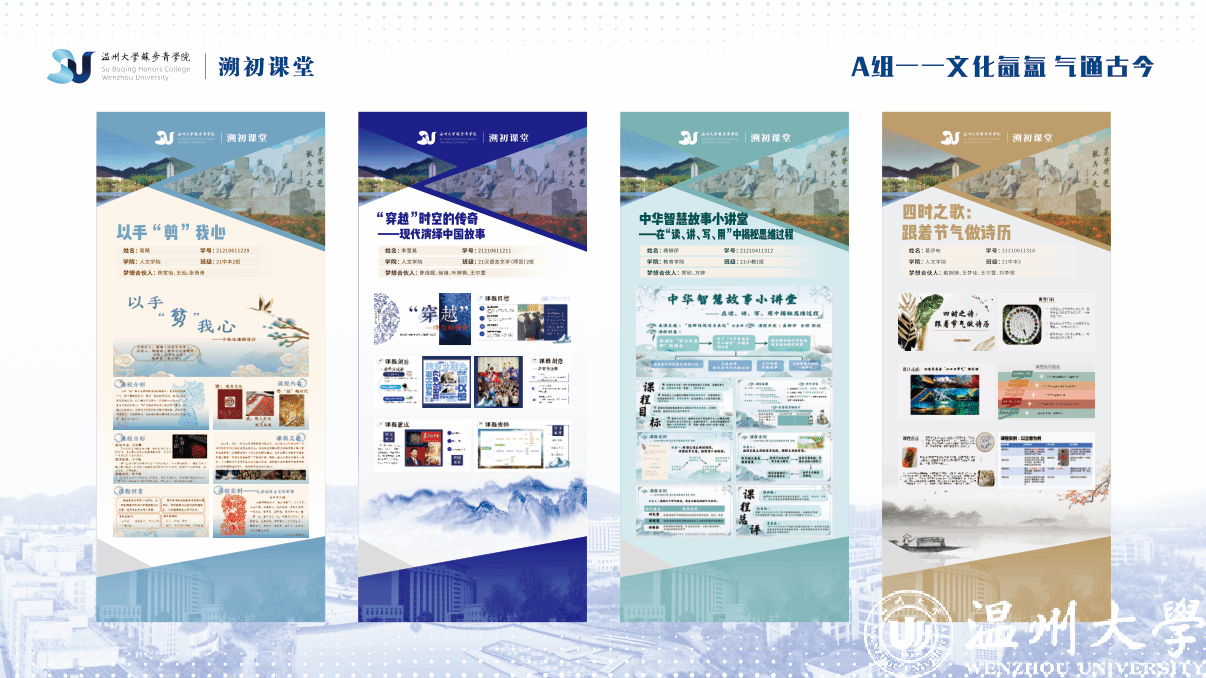 近日,澳门银河官网 苏步青学院举办了一场个性化课程展,将中华传统文化与马克思主义相结合,与现代社会相结合,将多样态思政元素、多维度文化知识融合在课程设计中,从“文化氤氲气吞古今”到“自然变换妙手本心”再到“科技创新百感交融”,使个性化翩跹于课堂展示的画卷之上,让素养教育与知识性学习碰撞出不一样的火花,培养学生对中华传统文化的兴趣和热爱,在潜移默化中增强学生的文化自信。