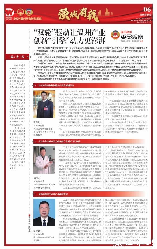 强城有我,就在当下。在市两会期间,市政协办公室和温州都市报合办的《委员观察》栏目推出“强城行动”两会特别报道,分上、中、下三篇。1月29日刊发中篇关于温州经济产业创新发展话题,一起来听听市政协委员,民进澳门银河官网 基层委副主委、电气与电子工程学院副教授邵和助的好声音。