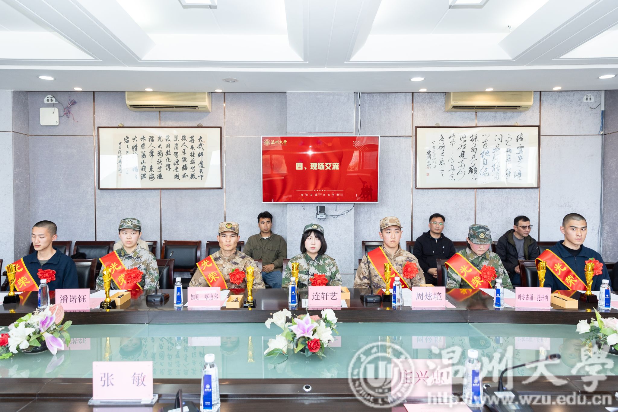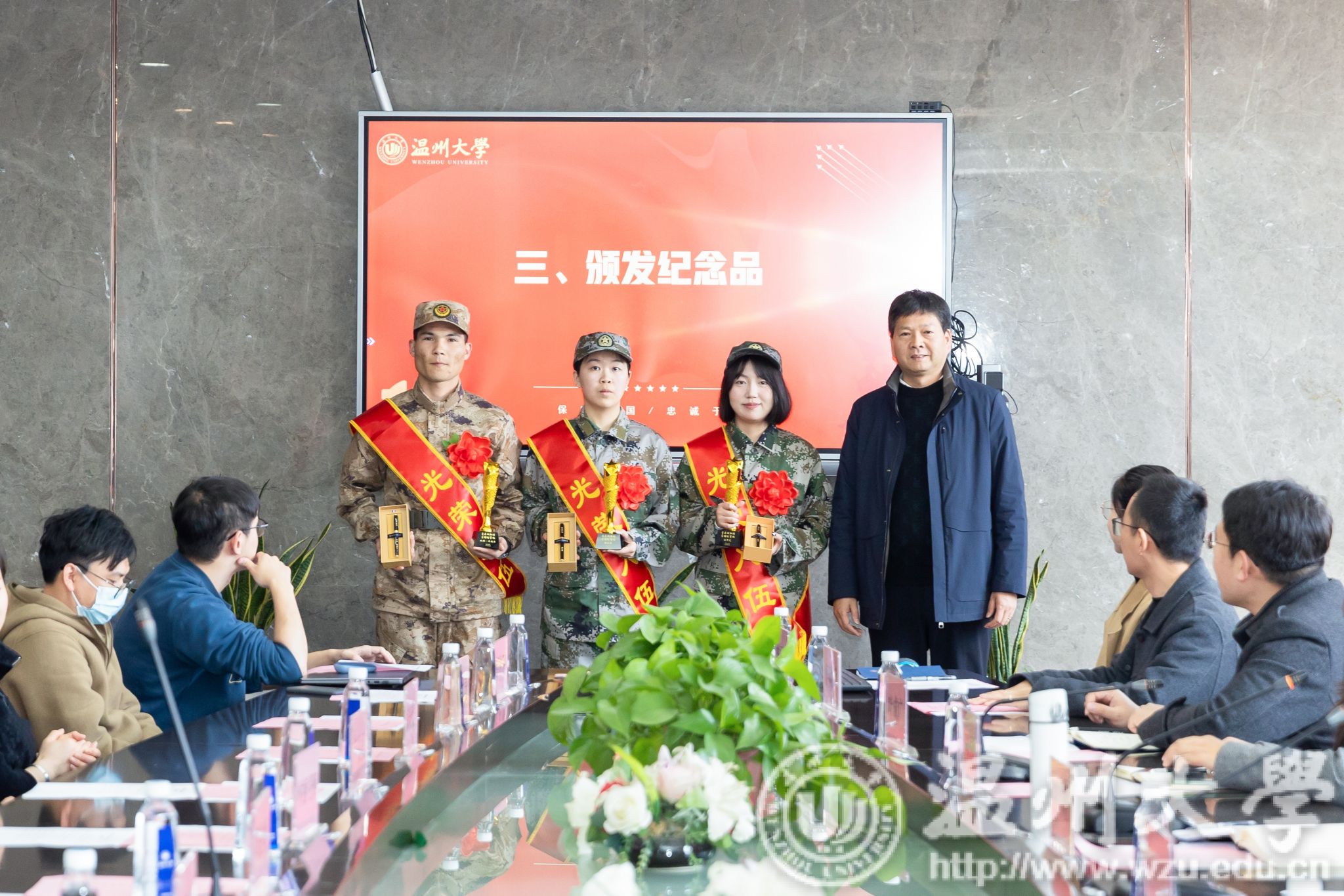 学工负责人介绍了2024年应征入伍学生总体情况。学院负责人为本院应征入伍的同学们披上象征荣誉的绶带并佩戴大红花。这不仅是对他们过往努力的肯定,更是对他们未来军旅生涯的美好祝愿。