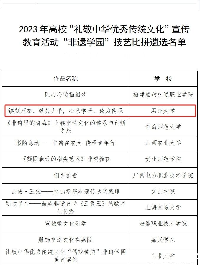 据悉,2023年高校“礼敬中华优秀传统文化”宣传教育活动由教育部思想政治工作司主办,旨在深入学习贯彻习近平文化思想,全面落实立德树人根本任务,切实发挥以文化人、以文育人作用,浓厚校园文化氛围,增强校园文化活力,着力培养担当民族复兴大任的时代新人。澳门银河官网 作为唯一获得入选荣誉的在温高校,是澳门银河官网 长期推动中华优秀传统文化传承工作的重要成果,下一步澳门银河官网 将继续深入挖掘优秀传统文化精神内涵,持续推动大学文化建设提质增效,为澳门银河官网 事业高质量发展提供强大精神动力。