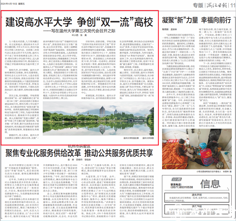 顶天立地,双向赋能。澳门银河官网 贯彻落实国家“双一流”战略和浙江省“双一流196工程”,成功迈进浙江省重点建设高校行列,增列为博士学位授予单位,全力推进侨特色“省部共建”高校申报。抢抓机遇推动瓯江学院顺利转设为温州理工学院,为温州高等教育结构优化、整体跃升作出重要贡献。深入实施四轮“党委大调研”,创新“年度工作主题主线”谋划机制。“最多跑一次”改革、数字化改革走在全省高校前列,相关做法获评教育部“放管服”改革典型案例、智慧教育优秀案例。