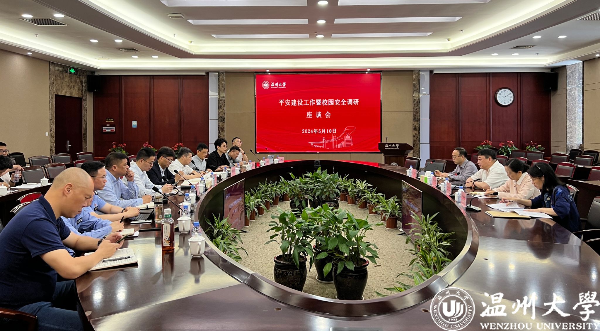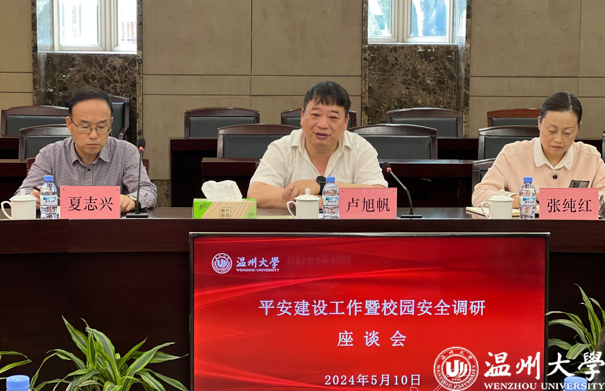 5月10日上午,瓯海平安建设工作暨校园安全调研座谈会在澳门银河官网 召开,市委政法委常务副书记卢旭帆、校党委副书记庄兴忠出席会议并讲话。相关职能单位负责人参会调研。
