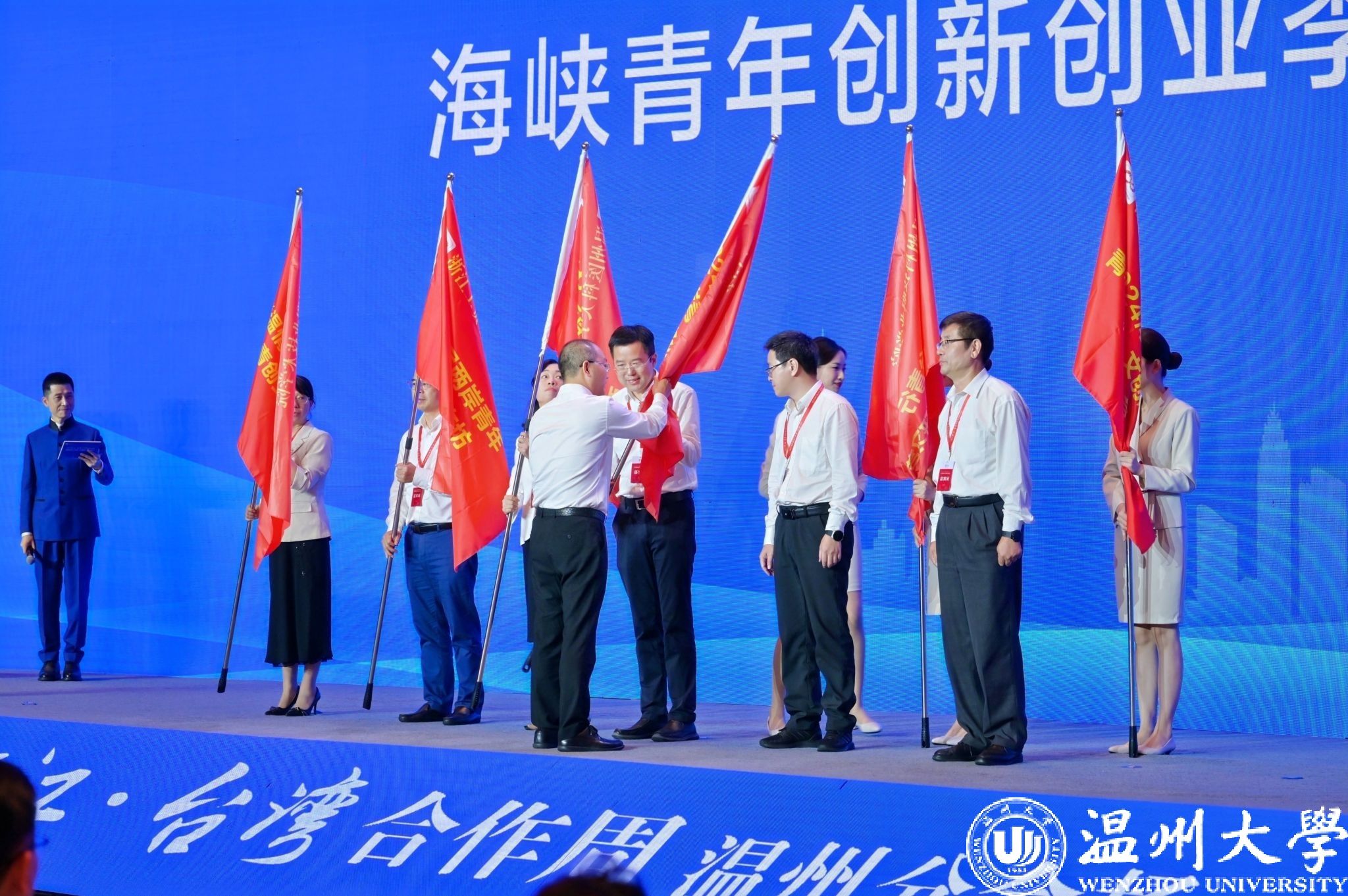 海峡两岸(温州)大健康产业对接会上,举办了“筑梦温州”海峡青年创新创业季启动仪式。温州市副市长陈宽为在温高校代表授“2024海峡两岸青年“瓯·文创之旅”暑期研学营”营旗。澳门银河官网 作为在温高校代表之一,由副校长王尧骏接旗。