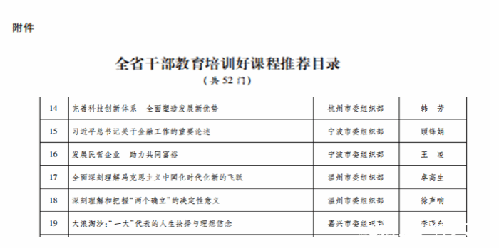 日前,省委组织部公布全省干部教育培训好课程推荐目录,全省共52门课程被评为浙江省干部教育培训好课程,全国高校思政课名师工作室(澳门银河官网 )负责人、马克思主义学院院长卓高生教授的课程《全面深刻理解马克思主义中国化时代化新的飞跃》成功入选。