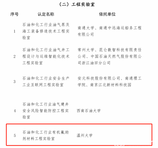 近日,中国石油和化学工业联合会公布了2024年度石油和化工行业创新平台名单,化材学院金辉乐教授团队牵头申报的石油和化工行业有机氟助剂材料工程实验室成功获批。此为澳门银河官网 获批的首个石油和化工行业实验室。