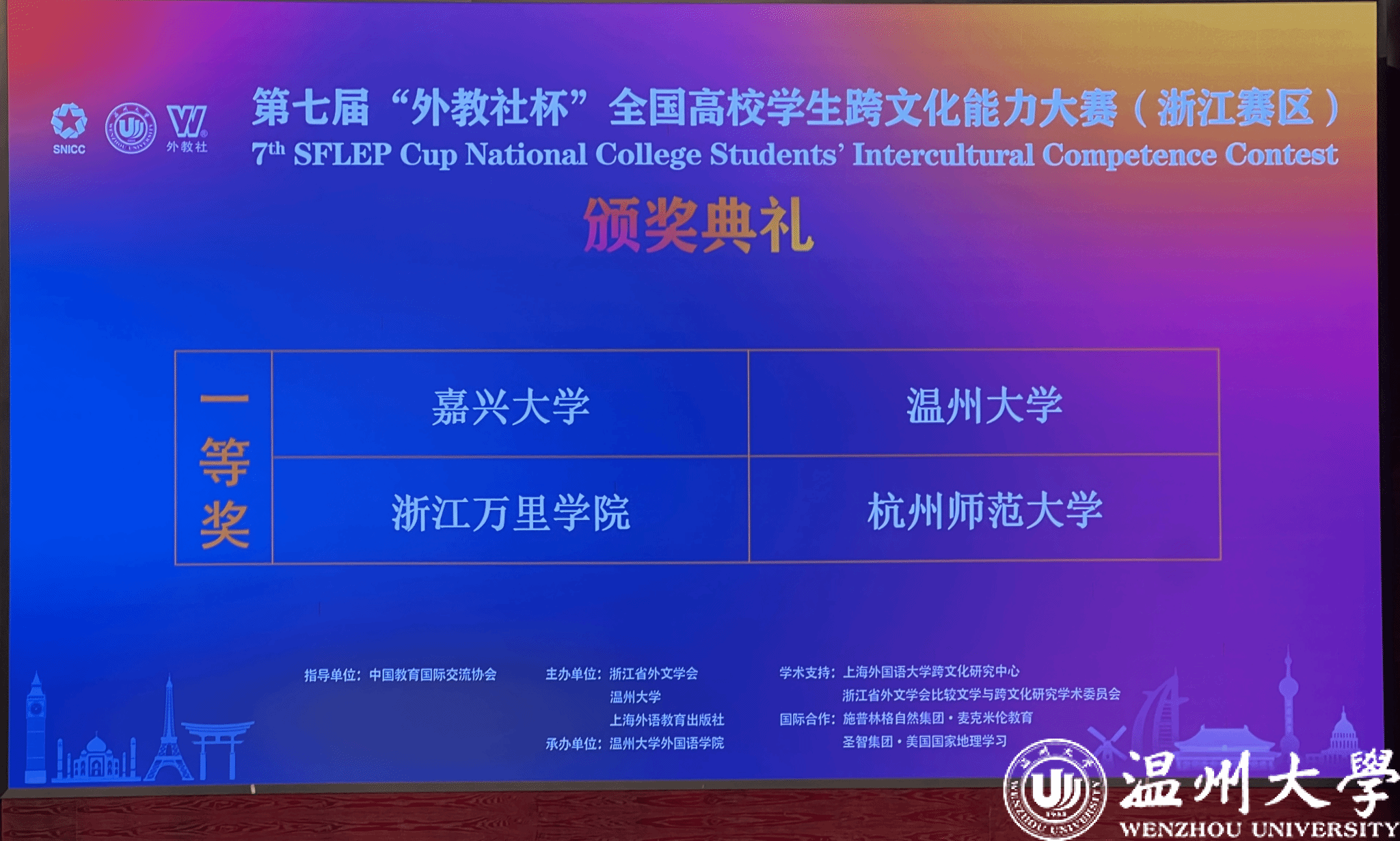 11月16-17日,第七届“外教社杯”全国高校学生跨文化能力大赛(浙江赛区)复赛/决赛在澳门银河官网 成功举办。该赛事由浙江省外文协会、澳门银河官网 和上海外语教育出版社联合主办,澳门银河官网 外国语学院承办。经过2天的激烈角逐,澳门银河官网 代表队不辱使命,成功夺得“一等奖”。