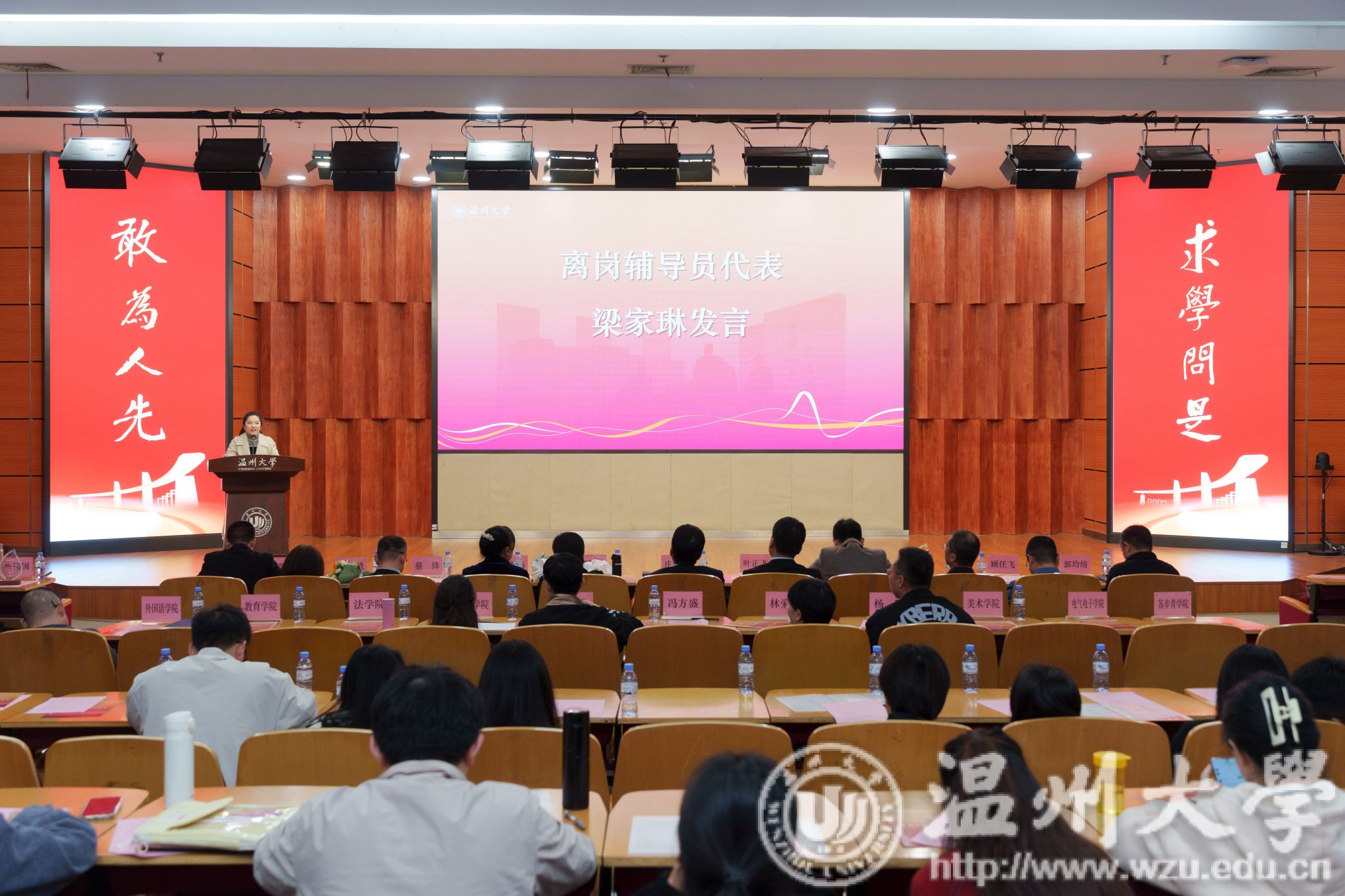 离岗辅导员欢送仪式环节,校学生工作委员会委员为离岗辅导员颁发纪念奖杯。离岗辅导员梁家琳作为代表发言,深情回顾了自己的辅导员生涯,表达了对新入职辅导员的期望和祝福。