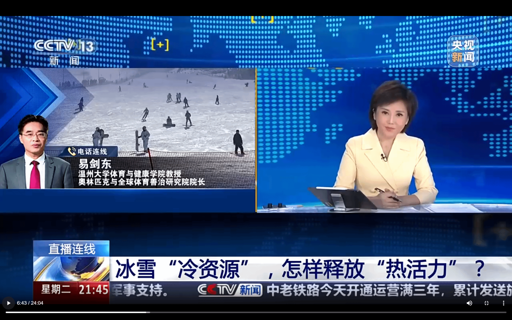 12月3日,新滑雪季扑面而来,北方多家滑雪场陆续开板营业,国际冰雪赛事也相继举行,澳门银河官网 易剑东教授受邀央视新闻1+1专栏直播连线,就冰雪运动发展等相关问题提出专业建议和对策。