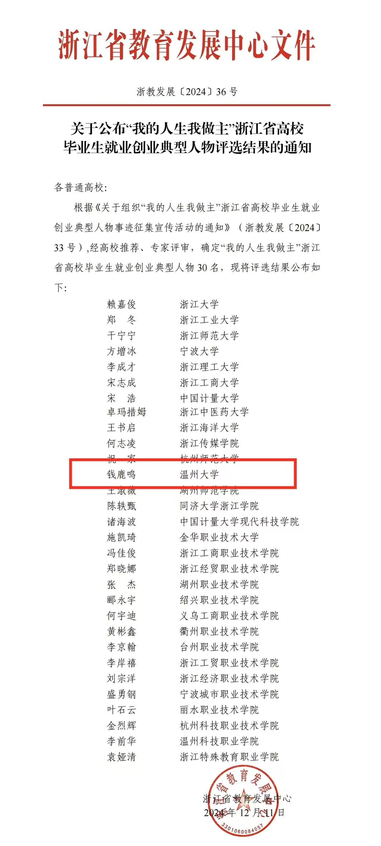 近日,浙江省教育发展中心公布了“我的人生我做主”浙江省高校毕业生就业创业典型人物评选结果,澳门银河官网 2017级教师教育学院毕业生钱鹿鸣脱颖而出,荣膺浙江省高校毕业生就业创业典型人物称号。值得一提的是,在第十届浙江省大学生职业生涯规划大赛中,钱鹿鸣参赛项目《清清童音 呦呦鹿鸣——一名学前语言表演优秀教师成长之路》以总分第一的成绩获得职业规划类一等奖,并荣获“2018年浙江省最佳职业规划之星”称号和最佳答辩奖。