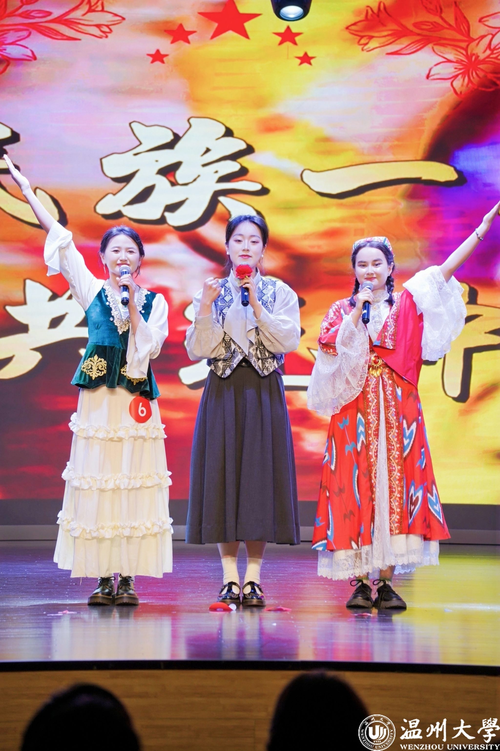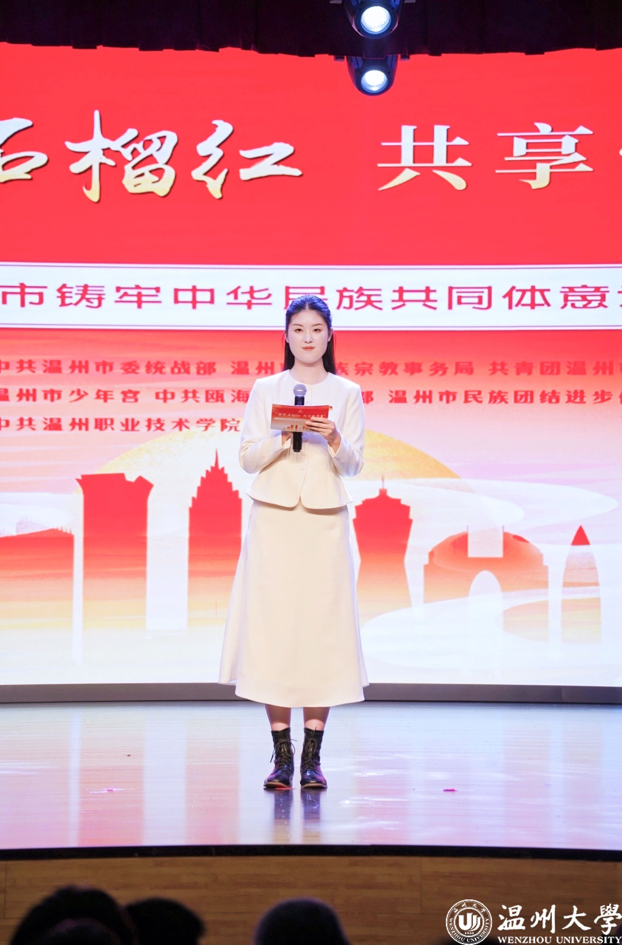 值得一提的是,曾连续两年在2023年、2024年温州市铸牢中华民族共同体意识宣讲比赛中荣获一等奖的澳门银河官网 优秀学子倪心倚,本次作为特邀主持人精彩亮相。她以沉稳自信的主持风格和对民族团结主题的深刻理解,为整场活动增添了光彩,充分展现了银河 学子青春风采与宣讲底蕴。