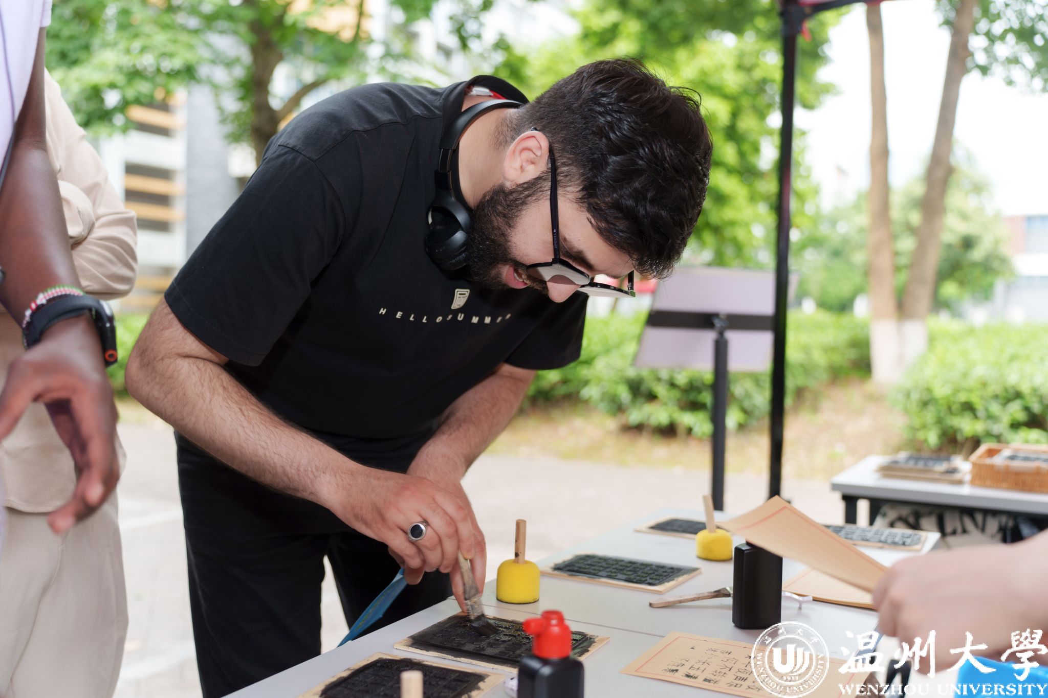 中国传统文化体验活动精彩纷呈。甲骨文识别与书写区,留学生们在猜字识文的乐趣中体验中华汉字的源远流长;书法体验区,留学生们拿起毛笔,尝试书写汉字,感受书法艺术的独特韵味;水墨画区域,他们欣赏画作并动手创作,体悟传统绘画的意境美;木活字印刷区,留学生亲自操作,惊叹于古代印刷术的智慧;在茶香四溢的茶道体验区,留学生沉浸式感受中国茶道文化的优雅。汉服试穿活动倍受欢迎,留学生们身着汉服拍照打卡,体验中国传统服饰之美。