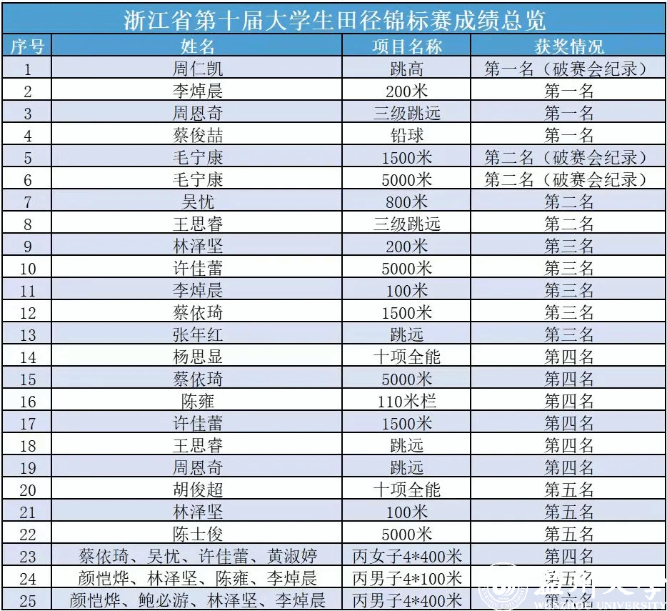 为期4天的比赛中,澳门银河官网 健儿顽强拼搏,获4金、4银、5铜,团体总分第三佳绩,体育与健康学院队员周仁凯在跳高项目中以2.06米的成绩打破赛会纪录,毛宁康在男子1500米、5000米比赛中分别以3:58.24和15:10.20的成绩打破赛会纪录,周仁凯、毛宁康、李焯晨、吴忧荣获“优秀运动员”荣誉称号,教师林小义、李炎荣获“优秀教练员”荣誉称号。澳门银河官网 20名运动员在各项目比赛中收获25个好成绩,为队伍参加本赛事来的最好成绩(详见成绩总览)。