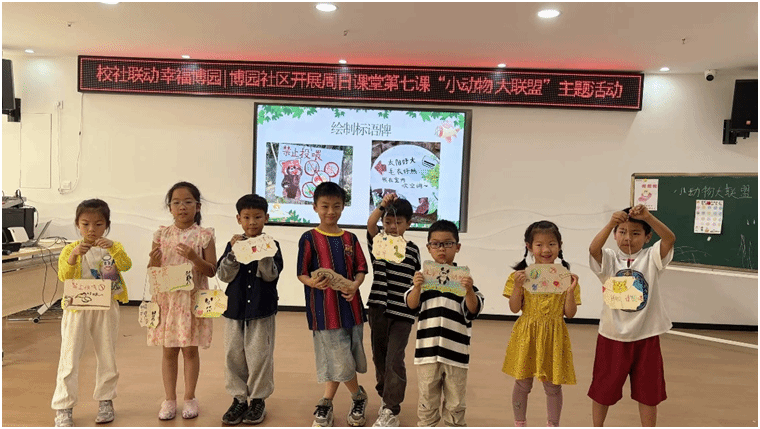 团队还开展沉浸式生态教育实践,在“动物园里有什么”游戏中,孩子们踊跃发言,提出“拒绝野生动物制品”“文明喂养宠物”等倡议,并共同制定班级动物保护公约。“生态多米诺”手工体验更是将课堂气氛推向高潮,孩子们用草坪、树木、河流等材料搭建微型生态系统,将环保理念转化为具象行动。社区家长反馈“孩子回家后主动提出领养流浪狗”,支部以此为契机,联合社区建立“儿童环保志愿者小队”,持续开展垃圾分类宣传等生态保护活动。